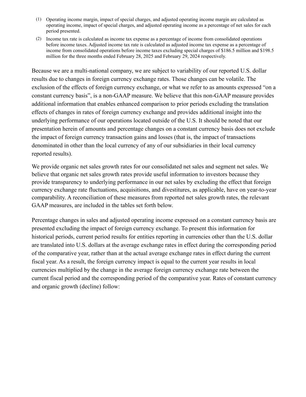 (1) Operating income margin, impact of special charges, and adjusted operating income margin are calculated as operating income, impact of special charges, and adjusted operating income as a percentage of net sales for each period presented. (2) Income tax rate is calculated as income tax expense as a percentage of income from consolidated operations before income taxes. Adjusted income tax rate is calculated as adjusted income tax expense as a percentage of income from consolidated operations before income taxes excluding special charges of $186.5 million and $198.5 million for the three months ended February 28, 2025 and February 29, 2024 respectively. Because we are a multi-national company, we are subject to variability of our reported U.S. dollar results due to changes in foreign currency exchange rates. Those changes can be volatile. The exclusion of the effects of foreign currency exchange, or what we refer to as amounts expressed “on a constant currency basis”, is a non-GAAP measure. We believe that this non-GAAP measure provides additional information that enables enhanced comparison to prior periods excluding the translation effects of changes in rates of foreign currency exchange and provides additional insight into the underlying performance of our operations located outside of the U.S. It should be noted that our presentation herein of amounts and percentage changes on a constant currency basis does not exclude the impact of foreign currency transaction gains and losses (that is, the impact of transactions denominated in other than the local currency of any of our subsidiaries in their local currency reported results). We provide organic net sales growth rates for our consolidated net sales and segment net sales. We believe that organic net sales growth rates provide useful information to investors because they provide transparency to underlying performance in our net sales by excluding the effect that foreign currency exchange rate fluctuations, acquisitions, and divestitures, as applicable, have on year-to-year comparability. A reconciliation of these measures from reported net sales growth rates, the relevant GAAP measures, are included in the tables set forth below. Percentage changes in sales and adjusted operating income expressed on a constant currency basis are presented excluding the impact of foreign currency exchange. To present this information for historical periods, current period results for entities reporting in currencies other than the U.S. dollar are translated into U.S. dollars at the average exchange rates in effect during the corresponding period of the comparative year, rather than at the actual average exchange rates in effect during the current fiscal year. As a result, the foreign currency impact is equal to the current year results in local currencies multiplied by the change in the average foreign currency exchange rate between the current fiscal period and the corresponding period of the comparative year. Rates of constant currency and organic growth (decline) follow: