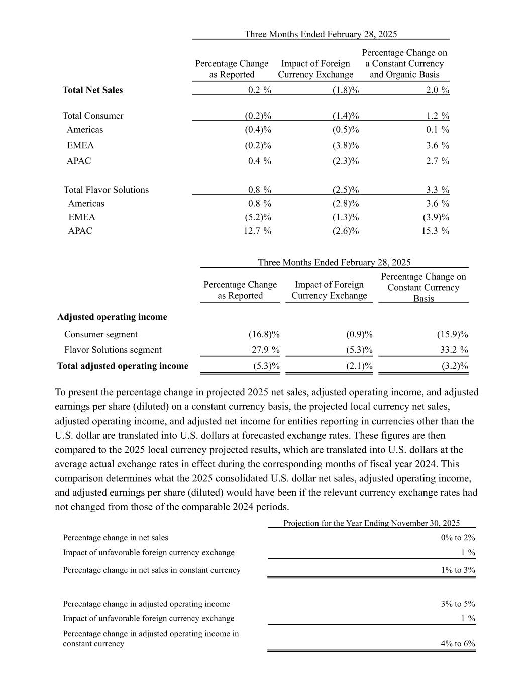 Three Months Ended February 28, 2025 Percentage Change as Reported Impact of Foreign Currency Exchange Percentage Change on a Constant Currency and Organic Basis Total Net Sales 0.2 % (1.8) % 2.0 % Total Consumer (0.2) % (1.4) % 1.2 % Americas (0.4) % (0.5) % 0.1 % EMEA (0.2) % (3.8) % 3.6 % APAC 0.4 % (2.3) % 2.7 % Total Flavor Solutions 0.8 % (2.5) % 3.3 % Americas 0.8 % (2.8) % 3.6 % EMEA (5.2) % (1.3) % (3.9) % APAC 12.7 % (2.6) % 15.3 % Three Months Ended February 28, 2025 Percentage Change as Reported Impact of Foreign Currency Exchange Percentage Change on Constant Currency Basis Adjusted operating income Consumer segment (16.8) % (0.9) % (15.9) % Flavor Solutions segment 27.9 % (5.3) % 33.2 % Total adjusted operating income (5.3) % (2.1) % (3.2) % To present the percentage change in projected 2025 net sales, adjusted operating income, and adjusted earnings per share (diluted) on a constant currency basis, the projected local currency net sales, adjusted operating income, and adjusted net income for entities reporting in currencies other than the U.S. dollar are translated into U.S. dollars at forecasted exchange rates. These figures are then compared to the 2025 local currency projected results, which are translated into U.S. dollars at the average actual exchange rates in effect during the corresponding months of fiscal year 2024. This comparison determines what the 2025 consolidated U.S. dollar net sales, adjusted operating income, and adjusted earnings per share (diluted) would have been if the relevant currency exchange rates had not changed from those of the comparable 2024 periods. Projection for the Year Ending November 30, 2025 Percentage change in net sales 0% to 2% Impact of unfavorable foreign currency exchange 1 % Percentage change in net sales in constant currency 1% to 3% Percentage change in adjusted operating income 3% to 5% Impact of unfavorable foreign currency exchange 1 % Percentage change in adjusted operating income in constant currency 4% to 6%