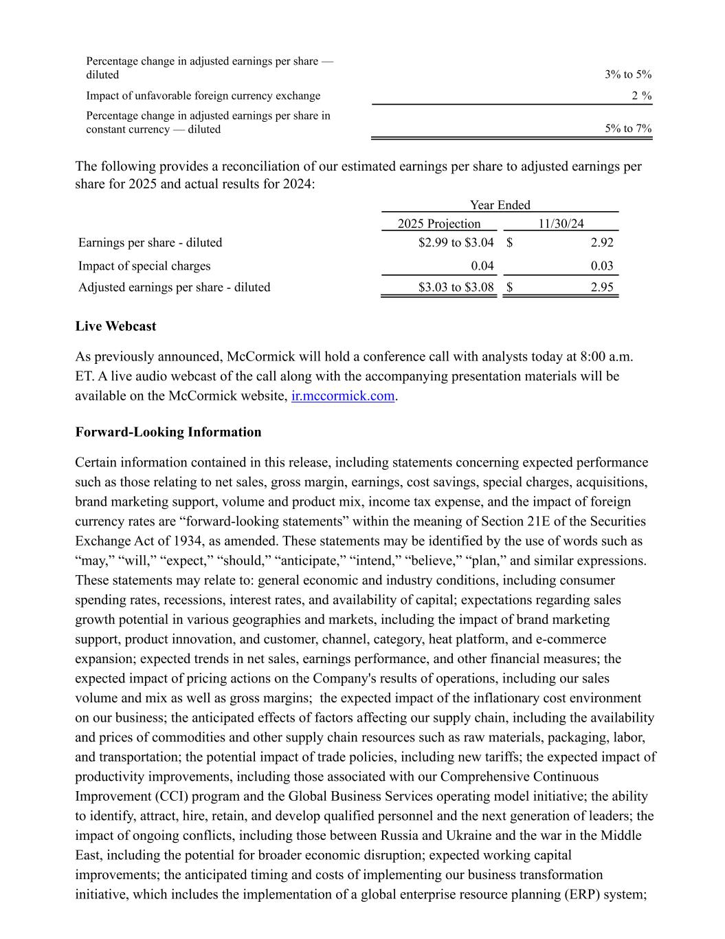 Percentage change in adjusted earnings per share — diluted 3% to 5% Impact of unfavorable foreign currency exchange 2 % Percentage change in adjusted earnings per share in constant currency — diluted 5% to 7% The following provides a reconciliation of our estimated earnings per share to adjusted earnings per share for 2025 and actual results for 2024: Year Ended 2025 Projection 11/30/24 Earnings per share - diluted $2.99 to $3.04 $ 2.92 Impact of special charges 0.04 0.03 Adjusted earnings per share - diluted $3.03 to $3.08 $ 2.95 Live Webcast As previously announced, McCormick will hold a conference call with analysts today at 8:00 a.m. ET. A live audio webcast of the call along with the accompanying presentation materials will be available on the McCormick website, ir.mccormick.com. Forward-Looking Information Certain information contained in this release, including statements concerning expected performance such as those relating to net sales, gross margin, earnings, cost savings, special charges, acquisitions, brand marketing support, volume and product mix, income tax expense, and the impact of foreign currency rates are “forward-looking statements” within the meaning of Section 21E of the Securities Exchange Act of 1934, as amended. These statements may be identified by the use of words such as “may,” “will,” “expect,” “should,” “anticipate,” “intend,” “believe,” “plan,” and similar expressions. These statements may relate to: general economic and industry conditions, including consumer spending rates, recessions, interest rates, and availability of capital; expectations regarding sales growth potential in various geographies and markets, including the impact of brand marketing support, product innovation, and customer, channel, category, heat platform, and e-commerce expansion; expected trends in net sales, earnings performance, and other financial measures; the expected impact of pricing actions on the Company's results of operations, including our sales volume and mix as well as gross margins; the expected impact of the inflationary cost environment on our business; the anticipated effects of factors affecting our supply chain, including the availability and prices of commodities and other supply chain resources such as raw materials, packaging, labor, and transportation; the potential impact of trade policies, including new tariffs; the expected impact of productivity improvements, including those associated with our Comprehensive Continuous Improvement (CCI) program and the Global Business Services operating model initiative; the ability to identify, attract, hire, retain, and develop qualified personnel and the next generation of leaders; the impact of ongoing conflicts, including those between Russia and Ukraine and the war in the Middle East, including the potential for broader economic disruption; expected working capital improvements; the anticipated timing and costs of implementing our business transformation initiative, which includes the implementation of a global enterprise resource planning (ERP) system;