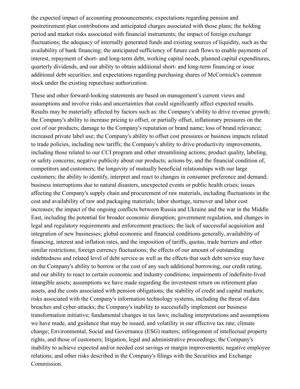 the expected impact of accounting pronouncements; expectations regarding pension and postretirement plan contributions and anticipated charges associated with those plans; the holding period and market risks associated with financial instruments; the impact of foreign exchange fluctuations; the adequacy of internally generated funds and existing sources of liquidity, such as the availability of bank financing; the anticipated sufficiency of future cash flows to enable payments of interest, repayment of short- and long-term debt, working capital needs, planned capital expenditures, quarterly dividends, and our ability to obtain additional short- and long-term financing or issue additional debt securities; and expectations regarding purchasing shares of McCormick's common stock under the existing repurchase authorization. These and other forward-looking statements are based on management’s current views and assumptions and involve risks and uncertainties that could significantly affect expected results. Results may be materially affected by factors such as: the Company's ability to drive revenue growth; the Company's ability to increase pricing to offset, or partially offset, inflationary pressures on the cost of our products; damage to the Company's reputation or brand name; loss of brand relevance; increased private label use; the Company's ability to offset cost pressures or business impacts related to trade policies, including new tariffs; the Company's ability to drive productivity improvements, including those related to our CCI program and other streamlining actions; product quality, labeling, or safety concerns; negative publicity about our products; actions by, and the financial condition of, competitors and customers; the longevity of mutually beneficial relationships with our large customers; the ability to identify, interpret and react to changes in consumer preference and demand; business interruptions due to natural disasters, unexpected events or public health crises; issues affecting the Company's supply chain and procurement of raw materials, including fluctuations in the cost and availability of raw and packaging materials; labor shortage, turnover and labor cost increases; the impact of the ongoing conflicts between Russia and Ukraine and the war in the Middle East, including the potential for broader economic disruption; government regulation, and changes in legal and regulatory requirements and enforcement practices; the lack of successful acquisition and integration of new businesses; global economic and financial conditions generally, availability of financing, interest and inflation rates, and the imposition of tariffs, quotas, trade barriers and other similar restrictions; foreign currency fluctuations; the effects of our amount of outstanding indebtedness and related level of debt service as well as the effects that such debt service may have on the Company's ability to borrow or the cost of any such additional borrowing, our credit rating, and our ability to react to certain economic and industry conditions; impairments of indefinite-lived intangible assets; assumptions we have made regarding the investment return on retirement plan assets, and the costs associated with pension obligations; the stability of credit and capital markets; risks associated with the Company's information technology systems, including the threat of data breaches and cyber-attacks; the Company's inability to successfully implement our business transformation initiative; fundamental changes in tax laws; including interpretations and assumptions we have made, and guidance that may be issued, and volatility in our effective tax rate; climate change; Environmental, Social and Governance (ESG) matters; infringement of intellectual property rights, and those of customers; litigation, legal and administrative proceedings; the Company's inability to achieve expected and/or needed cost savings or margin improvements; negative employee relations; and other risks described in the Company's filings with the Securities and Exchange Commission.