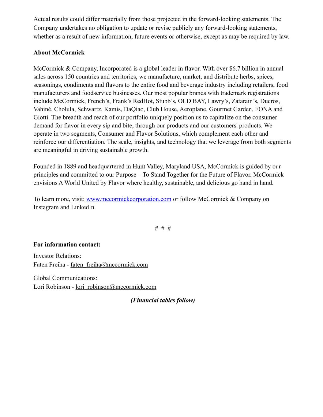 Actual results could differ materially from those projected in the forward-looking statements. The Company undertakes no obligation to update or revise publicly any forward-looking statements, whether as a result of new information, future events or otherwise, except as may be required by law. About McCormick McCormick & Company, Incorporated is a global leader in flavor. With over $6.7 billion in annual sales across 150 countries and territories, we manufacture, market, and distribute herbs, spices, seasonings, condiments and flavors to the entire food and beverage industry including retailers, food manufacturers and foodservice businesses. Our most popular brands with trademark registrations include McCormick, French’s, Frank’s RedHot, Stubb’s, OLD BAY, Lawry’s, Zatarain’s, Ducros, Vahiné, Cholula, Schwartz, Kamis, DaQiao, Club House, Aeroplane, Gourmet Garden, FONA and Giotti. The breadth and reach of our portfolio uniquely position us to capitalize on the consumer demand for flavor in every sip and bite, through our products and our customers' products. We operate in two segments, Consumer and Flavor Solutions, which complement each other and reinforce our differentiation. The scale, insights, and technology that we leverage from both segments are meaningful in driving sustainable growth. Founded in 1889 and headquartered in Hunt Valley, Maryland USA, McCormick is guided by our principles and committed to our Purpose – To Stand Together for the Future of Flavor. McCormick envisions A World United by Flavor where healthy, sustainable, and delicious go hand in hand. To learn more, visit: www.mccormickcorporation.com or follow McCormick & Company on Instagram and LinkedIn. # # # For information contact: Investor Relations: Faten Freiha - faten_freiha@mccormick.com Global Communications: Lori Robinson - lori_robinson@mccormick.com (Financial tables follow)