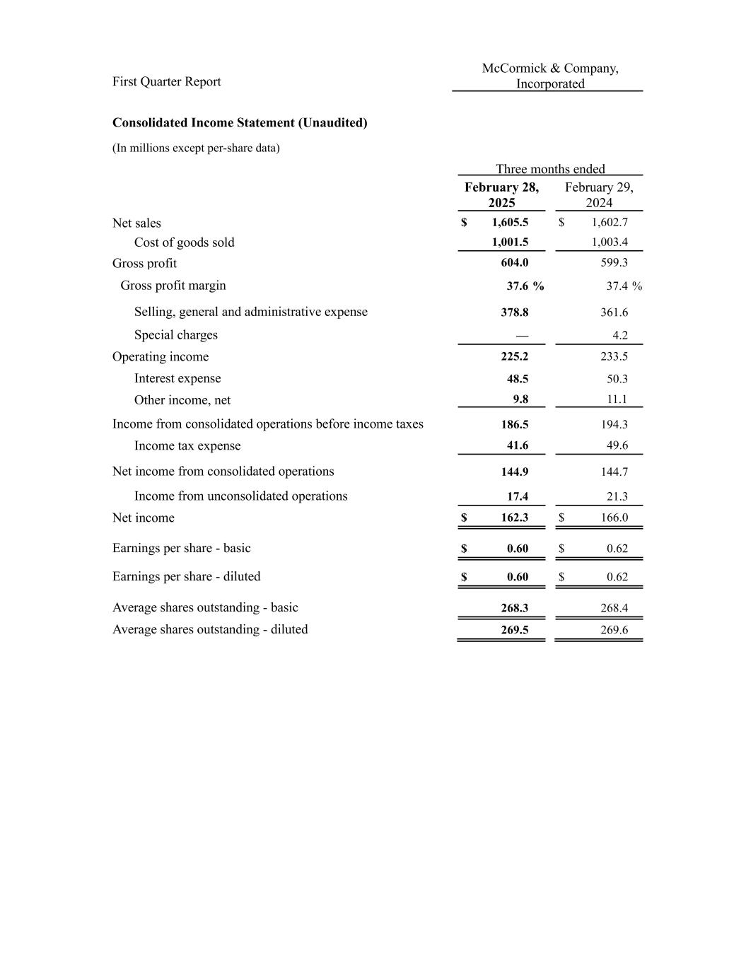 First Quarter Report McCormick & Company, Incorporated Consolidated Income Statement (Unaudited) (In millions except per-share data) Three months ended February 28, 2025 February 29, 2024 Net sales $ 1,605.5 $ 1,602.7 Cost of goods sold 1,001.5 1,003.4 Gross profit 604.0 599.3 Gross profit margin 37.6 % 37.4 % Selling, general and administrative expense 378.8 361.6 Special charges — 4.2 Operating income 225.2 233.5 Interest expense 48.5 50.3 Other income, net 9.8 11.1 Income from consolidated operations before income taxes 186.5 194.3 Income tax expense 41.6 49.6 Net income from consolidated operations 144.9 144.7 Income from unconsolidated operations 17.4 21.3 Net income $ 162.3 $ 166.0 Earnings per share - basic $ 0.60 $ 0.62 Earnings per share - diluted $ 0.60 $ 0.62 Average shares outstanding - basic 268.3 268.4 Average shares outstanding - diluted 269.5 269.6