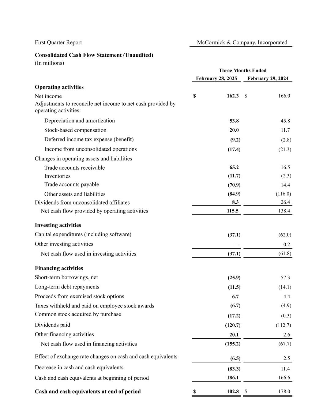 First Quarter Report McCormick & Company, Incorporated Consolidated Cash Flow Statement (Unaudited) (In millions) Three Months Ended February 28, 2025 February 29, 2024 Operating activities Net income $ 162.3 $ 166.0 Adjustments to reconcile net income to net cash provided by operating activities: Depreciation and amortization 53.8 45.8 Stock-based compensation 20.0 11.7 Deferred income tax expense (benefit) (9.2) (2.8) Income from unconsolidated operations (17.4) (21.3) Changes in operating assets and liabilities Trade accounts receivable 65.2 16.5 Inventories (11.7) (2.3) Trade accounts payable (70.9) 14.4 Other assets and liabilities (84.9) (116.0) Dividends from unconsolidated affiliates 8.3 26.4 Net cash flow provided by operating activities 115.5 138.4 Investing activities Capital expenditures (including software) (37.1) (62.0) Other investing activities — 0.2 Net cash flow used in investing activities (37.1) (61.8) Financing activities Short-term borrowings, net (25.9) 57.3 Long-term debt repayments (11.5) (14.1) Proceeds from exercised stock options 6.7 4.4 Taxes withheld and paid on employee stock awards (6.7) (4.9) Common stock acquired by purchase (17.2) (0.3) Dividends paid (120.7) (112.7) Other financing activities 20.1 2.6 Net cash flow used in financing activities (155.2) (67.7) Effect of exchange rate changes on cash and cash equivalents (6.5) 2.5 Decrease in cash and cash equivalents (83.3) 11.4 Cash and cash equivalents at beginning of period 186.1 166.6 Cash and cash equivalents at end of period $ 102.8 $ 178.0