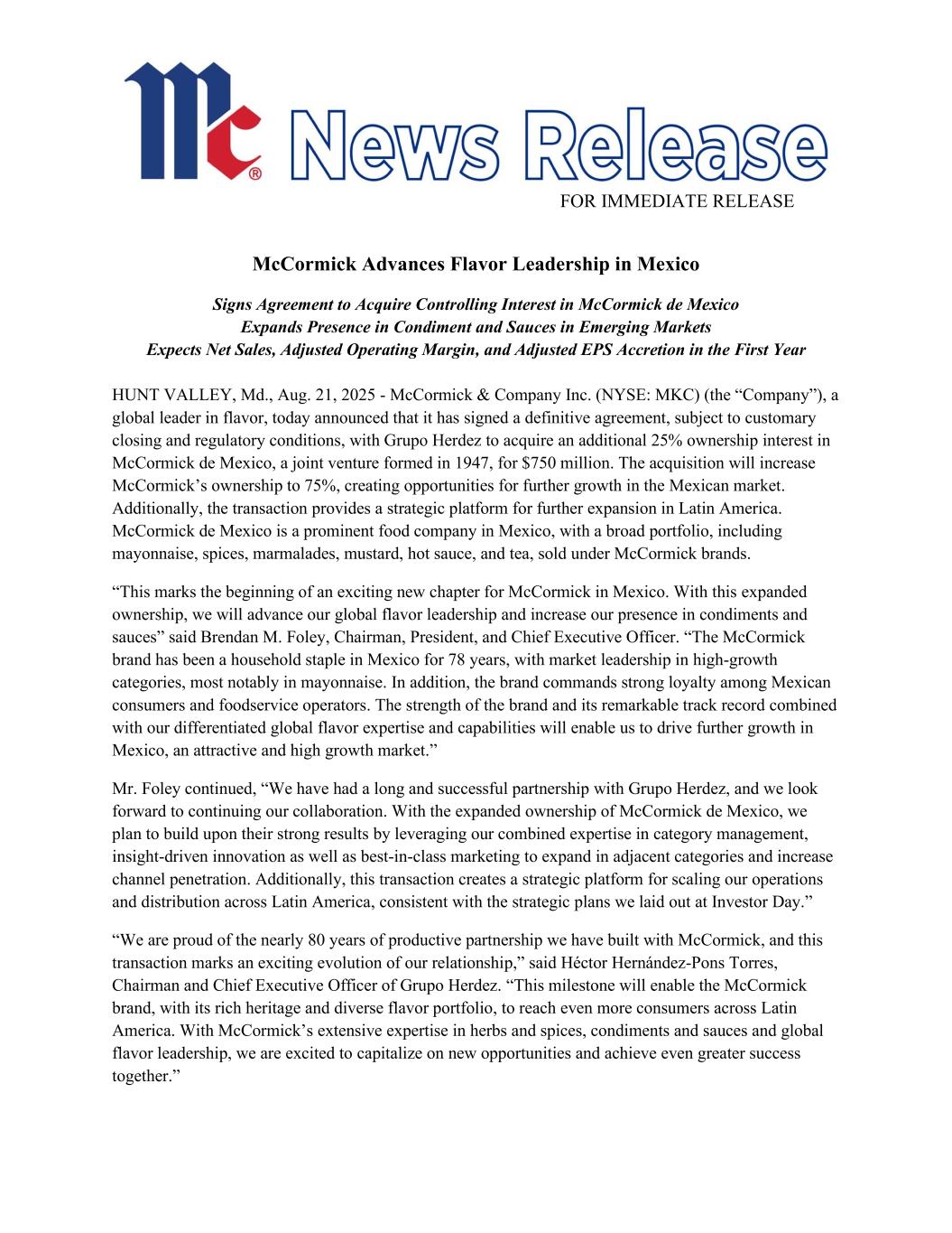 FOR IMMEDIATE RELEASE McCormick Advances Flavor Leadership in Mexico Signs Agreement to Acquire Controlling Interest in McCormick de Mexico Expands Presence in Condiment and Sauces in Emerging Markets Expects Net Sales, Adjusted Operating Margin, and Adjusted EPS Accretion in the First Year HUNT VALLEY, Md., Aug. 21, 2025 - McCormick & Company Inc. (NYSE: MKC) (the “Company”), a global leader in flavor, today announced that it has signed a definitive agreement, subject to customary closing and regulatory conditions, with Grupo Herdez to acquire an additional 25% ownership interest in McCormick de Mexico, a joint venture formed in 1947, for $750 million. The acquisition will increase McCormick’s ownership to 75%, creating opportunities for further growth in the Mexican market. Additionally, the transaction provides a strategic platform for further expansion in Latin America. McCormick de Mexico is a prominent food company in Mexico, with a broad portfolio, including mayonnaise, spices, marmalades, mustard, hot sauce, and tea, sold under McCormick brands. “This marks the beginning of an exciting new chapter for McCormick in Mexico. With this expanded ownership, we will advance our global flavor leadership and increase our presence in condiments and sauces” said Brendan M. Foley, Chairman, President, and Chief Executive Officer. “The McCormick brand has been a household staple in Mexico for 78 years, with market leadership in high-growth categories, most notably in mayonnaise. In addition, the brand commands strong loyalty among Mexican consumers and foodservice operators. The strength of the brand and its remarkable track record combined with our differentiated global flavor expertise and capabilities will enable us to drive further growth in Mexico, an attractive and high growth market.” Mr. Foley continued, “We have had a long and successful partnership with Grupo Herdez, and we look forward to continuing our collaboration. With the expanded ownership of McCormick de Mexico, we plan to build upon their strong results by leveraging our combined expertise in category management, insight-driven innovation as well as best-in-class marketing to expand in adjacent categories and increase channel penetration. Additionally, this transaction creates a strategic platform for scaling our operations and distribution across Latin America, consistent with the strategic plans we laid out at Investor Day.” “We are proud of the nearly 80 years of productive partnership we have built with McCormick, and this transaction marks an exciting evolution of our relationship,” said Héctor Hernández-Pons Torres, Chairman and Chief Executive Officer of Grupo Herdez. “This milestone will enable the McCormick brand, with its rich heritage and diverse flavor portfolio, to reach even more consumers across Latin America. With McCormick’s extensive expertise in herbs and spices, condiments and sauces and global flavor leadership, we are excited to capitalize on new opportunities and achieve even greater success together.”