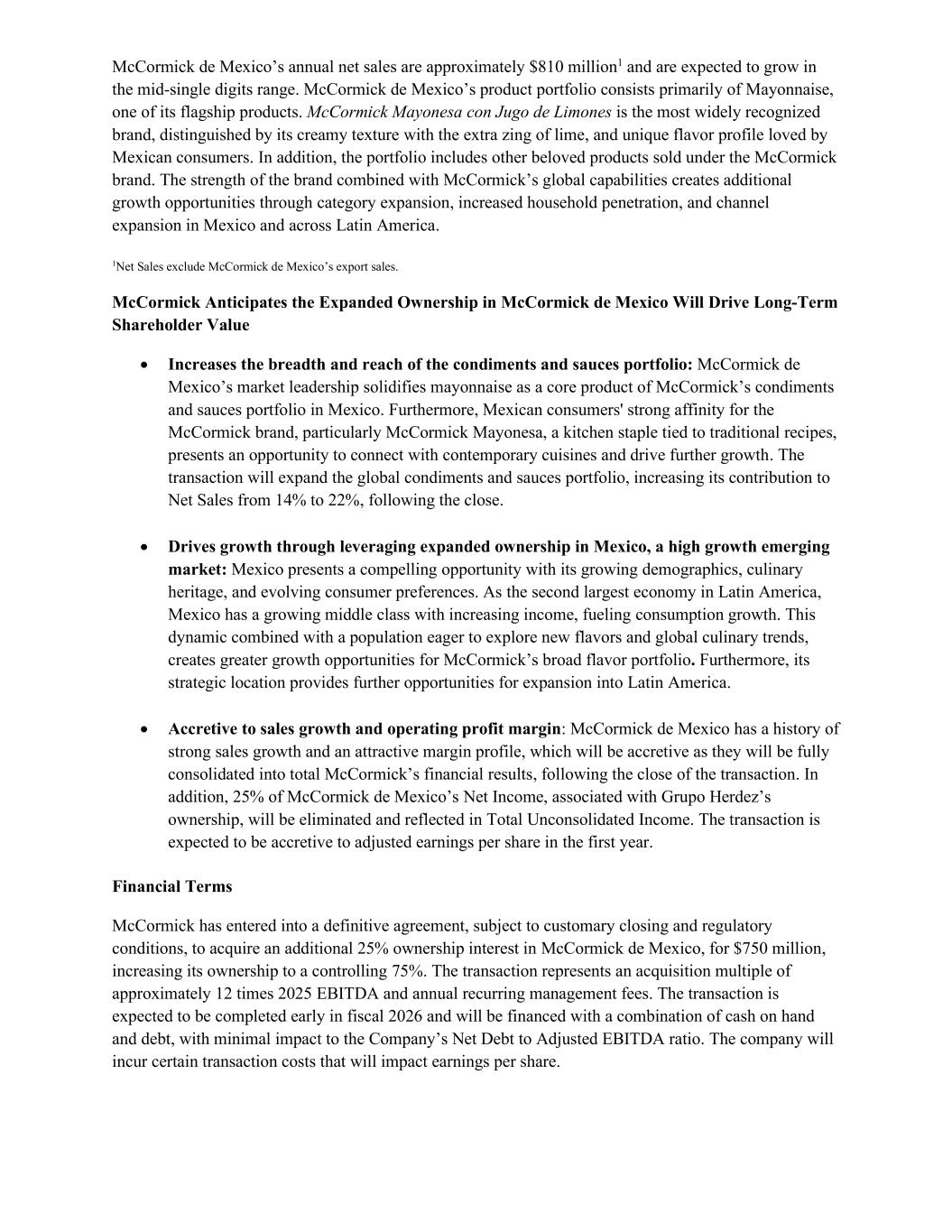McCormick de Mexico’s annual net sales are approximately $810 million1 and are expected to grow in the mid-single digits range. McCormick de Mexico’s product portfolio consists primarily of Mayonnaise, one of its flagship products. McCormick Mayonesa con Jugo de Limones is the most widely recognized brand, distinguished by its creamy texture with the extra zing of lime, and unique flavor profile loved by Mexican consumers. In addition, the portfolio includes other beloved products sold under the McCormick brand. The strength of the brand combined with McCormick’s global capabilities creates additional growth opportunities through category expansion, increased household penetration, and channel expansion in Mexico and across Latin America. 1Net Sales exclude McCormick de Mexico’s export sales. McCormick Anticipates the Expanded Ownership in McCormick de Mexico Will Drive Long-Term Shareholder Value • Increases the breadth and reach of the condiments and sauces portfolio: McCormick de Mexico’s market leadership solidifies mayonnaise as a core product of McCormick’s condiments and sauces portfolio in Mexico. Furthermore, Mexican consumers' strong affinity for the McCormick brand, particularly McCormick Mayonesa, a kitchen staple tied to traditional recipes, presents an opportunity to connect with contemporary cuisines and drive further growth. The transaction will expand the global condiments and sauces portfolio, increasing its contribution to Net Sales from 14% to 22%, following the close. • Drives growth through leveraging expanded ownership in Mexico, a high growth emerging market: Mexico presents a compelling opportunity with its growing demographics, culinary heritage, and evolving consumer preferences. As the second largest economy in Latin America, Mexico has a growing middle class with increasing income, fueling consumption growth. This dynamic combined with a population eager to explore new flavors and global culinary trends, creates greater growth opportunities for McCormick’s broad flavor portfolio. Furthermore, its strategic location provides further opportunities for expansion into Latin America. • Accretive to sales growth and operating profit margin: McCormick de Mexico has a history of strong sales growth and an attractive margin profile, which will be accretive as they will be fully consolidated into total McCormick’s financial results, following the close of the transaction. In addition, 25% of McCormick de Mexico’s Net Income, associated with Grupo Herdez’s ownership, will be eliminated and reflected in Total Unconsolidated Income. The transaction is expected to be accretive to adjusted earnings per share in the first year. Financial Terms McCormick has entered into a definitive agreement, subject to customary closing and regulatory conditions, to acquire an additional 25% ownership interest in McCormick de Mexico, for $750 million, increasing its ownership to a controlling 75%. The transaction represents an acquisition multiple of approximately 12 times 2025 EBITDA and annual recurring management fees. The transaction is expected to be completed early in fiscal 2026 and will be financed with a combination of cash on hand and debt, with minimal impact to the Company’s Net Debt to Adjusted EBITDA ratio. The company will incur certain transaction costs that will impact earnings per share.