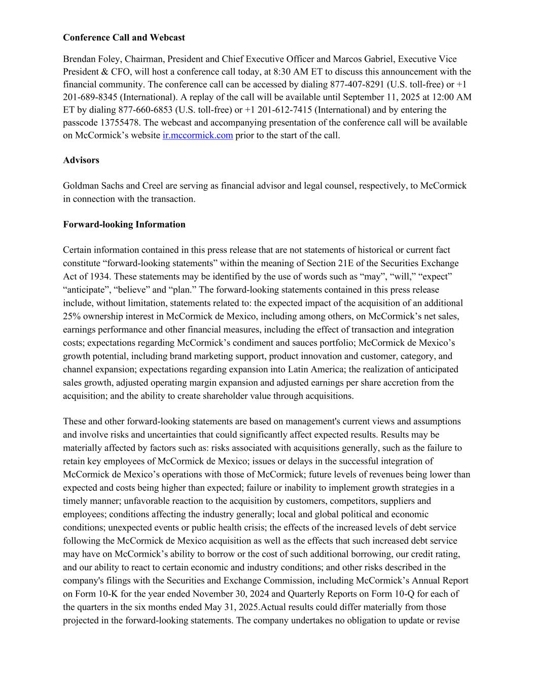 Conference Call and Webcast Brendan Foley, Chairman, President and Chief Executive Officer and Marcos Gabriel, Executive Vice President & CFO, will host a conference call today, at 8:30 AM ET to discuss this announcement with the financial community. The conference call can be accessed by dialing 877-407-8291 (U.S. toll-free) or +1 201-689-8345 (International). A replay of the call will be available until September 11, 2025 at 12:00 AM ET by dialing 877-660-6853 (U.S. toll-free) or +1 201-612-7415 (International) and by entering the passcode 13755478. The webcast and accompanying presentation of the conference call will be available on McCormick’s website ir.mccormick.com prior to the start of the call. Advisors Goldman Sachs and Creel are serving as financial advisor and legal counsel, respectively, to McCormick in connection with the transaction. Forward-looking Information Certain information contained in this press release that are not statements of historical or current fact constitute “forward-looking statements” within the meaning of Section 21E of the Securities Exchange Act of 1934. These statements may be identified by the use of words such as “may”, “will,” “expect” “anticipate”, “believe” and “plan.” The forward-looking statements contained in this press release include, without limitation, statements related to: the expected impact of the acquisition of an additional 25% ownership interest in McCormick de Mexico, including among others, on McCormick’s net sales, earnings performance and other financial measures, including the effect of transaction and integration costs; expectations regarding McCormick’s condiment and sauces portfolio; McCormick de Mexico’s growth potential, including brand marketing support, product innovation and customer, category, and channel expansion; expectations regarding expansion into Latin America; the realization of anticipated sales growth, adjusted operating margin expansion and adjusted earnings per share accretion from the acquisition; and the ability to create shareholder value through acquisitions. These and other forward-looking statements are based on management's current views and assumptions and involve risks and uncertainties that could significantly affect expected results. Results may be materially affected by factors such as: risks associated with acquisitions generally, such as the failure to retain key employees of McCormick de Mexico; issues or delays in the successful integration of McCormick de Mexico’s operations with those of McCormick; future levels of revenues being lower than expected and costs being higher than expected; failure or inability to implement growth strategies in a timely manner; unfavorable reaction to the acquisition by customers, competitors, suppliers and employees; conditions affecting the industry generally; local and global political and economic conditions; unexpected events or public health crisis; the effects of the increased levels of debt service following the McCormick de Mexico acquisition as well as the effects that such increased debt service may have on McCormick’s ability to borrow or the cost of such additional borrowing, our credit rating, and our ability to react to certain economic and industry conditions; and other risks described in the company's filings with the Securities and Exchange Commission, including McCormick’s Annual Report on Form 10-K for the year ended November 30, 2024 and Quarterly Reports on Form 10-Q for each of the quarters in the six months ended May 31, 2025.Actual results could differ materially from those projected in the forward-looking statements. The company undertakes no obligation to update or revise