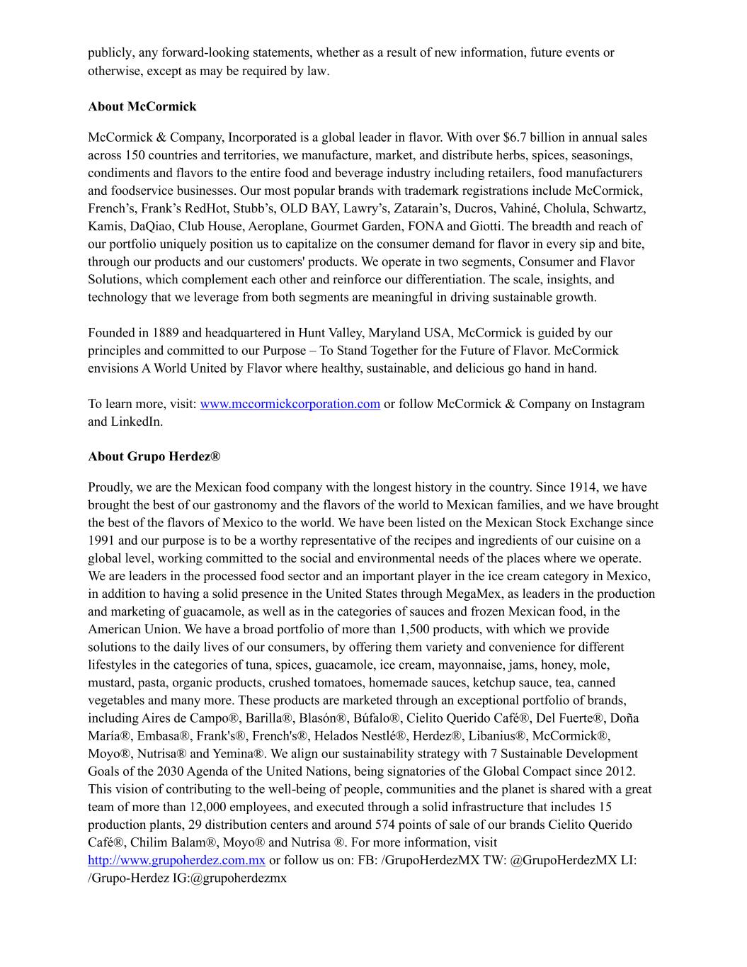 publicly, any forward-looking statements, whether as a result of new information, future events or otherwise, except as may be required by law. About McCormick McCormick & Company, Incorporated is a global leader in flavor. With over $6.7 billion in annual sales across 150 countries and territories, we manufacture, market, and distribute herbs, spices, seasonings, condiments and flavors to the entire food and beverage industry including retailers, food manufacturers and foodservice businesses. Our most popular brands with trademark registrations include McCormick, French’s, Frank’s RedHot, Stubb’s, OLD BAY, Lawry’s, Zatarain’s, Ducros, Vahiné, Cholula, Schwartz, Kamis, DaQiao, Club House, Aeroplane, Gourmet Garden, FONA and Giotti. The breadth and reach of our portfolio uniquely position us to capitalize on the consumer demand for flavor in every sip and bite, through our products and our customers' products. We operate in two segments, Consumer and Flavor Solutions, which complement each other and reinforce our differentiation. The scale, insights, and technology that we leverage from both segments are meaningful in driving sustainable growth. Founded in 1889 and headquartered in Hunt Valley, Maryland USA, McCormick is guided by our principles and committed to our Purpose – To Stand Together for the Future of Flavor. McCormick envisions A World United by Flavor where healthy, sustainable, and delicious go hand in hand. To learn more, visit: www.mccormickcorporation.com or follow McCormick & Company on Instagram and LinkedIn. About Grupo Herdez® Proudly, we are the Mexican food company with the longest history in the country. Since 1914, we have brought the best of our gastronomy and the flavors of the world to Mexican families, and we have brought the best of the flavors of Mexico to the world. We have been listed on the Mexican Stock Exchange since 1991 and our purpose is to be a worthy representative of the recipes and ingredients of our cuisine on a global level, working committed to the social and environmental needs of the places where we operate. We are leaders in the processed food sector and an important player in the ice cream category in Mexico, in addition to having a solid presence in the United States through MegaMex, as leaders in the production and marketing of guacamole, as well as in the categories of sauces and frozen Mexican food, in the American Union. We have a broad portfolio of more than 1,500 products, with which we provide solutions to the daily lives of our consumers, by offering them variety and convenience for different lifestyles in the categories of tuna, spices, guacamole, ice cream, mayonnaise, jams, honey, mole, mustard, pasta, organic products, crushed tomatoes, homemade sauces, ketchup sauce, tea, canned vegetables and many more. These products are marketed through an exceptional portfolio of brands, including Aires de Campo®, Barilla®, Blasón®, Búfalo®, Cielito Querido Café®, Del Fuerte®, Doña María®, Embasa®, Frank's®, French's®, Helados Nestlé®, Herdez®, Libanius®, McCormick®, Moyo®, Nutrisa® and Yemina®. We align our sustainability strategy with 7 Sustainable Development Goals of the 2030 Agenda of the United Nations, being signatories of the Global Compact since 2012. This vision of contributing to the well-being of people, communities and the planet is shared with a great team of more than 12,000 employees, and executed through a solid infrastructure that includes 15 production plants, 29 distribution centers and around 574 points of sale of our brands Cielito Querido Café®, Chilim Balam®, Moyo® and Nutrisa ®. For more information, visit http://www.grupoherdez.com.mx or follow us on: FB: /GrupoHerdezMX TW: @GrupoHerdezMX LI: /Grupo-Herdez IG:@grupoherdezmx