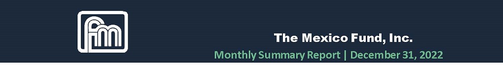 Global equity markets registered negative returns during December 2022. The MSCI World Index and the MSCI Emerging Markets Index decreased 4.3% and 1.6%, respectively, during the month. Major central banks kept tightening their monetary policy; the U.S. Federal Reserve (the “Fed”) raised again its target interest rate, albeit at a slower pace, with an increase of 50 basis points to a range of 4.25% and 4.50%. The European Central Bank and the Bank of England also increased its main refinancing rate and overnight interest rate, 50 basis points, to 2.50% and 3.50%, respectively. The DJIA and the S&P 500 decreased 4.2% and 5.9%, respectively, while the interest rate on the 10-year Treasury note increased 27 basis points to 3.87% and the U.S. dollar depreciated 2.3% (measured by the DXY Index4), during December 2022. In Mexico, the MSCI Mexico Index registered a decrease of 7.4% and the Mexican peso depreciated 1.2% during the month to Ps. $19.50, whereas the Fund’s NAV decreased 6.0%, outperforming its benchmark.