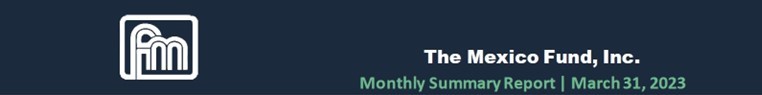 Global equity markets registered positive returns during March 2023. The MSCI World Index and the MSCI Emerging Markets Index increased 2.8% and 2.7%, respectively, during the month. Major central banks kept tightening their monetary policy; the U.S. Federal Reserve (the “Fed”) raised again its target interest rate, with an increase of 25 basis points to a range of 4.75% and 5.00%. The European Central Bank increased its main refinancing interest rate by 50 basis points to 3.50%, while the Bank of England increased its overnight interest rate by 25 basis points to 4.25%. The DJIA and the S&P 500 increased 1.9% and 3.5%, respectively, while the interest rate on the 10-year Treasury note decreased 45 basis points to 3.47% and the U.S. dollar depreciated 2.3% (measured by the DXY Index4), during March 2023. In Mexico, the MSCI Mexico Index registered an increase of 3.0% and the Mexican peso appreciated 1.4% during the month to Ps. $18.05, whereas the Fund’s NAV increased 3.4%, outperforming its benchmark.