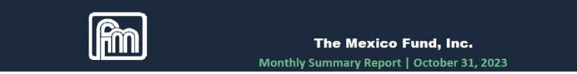 Global equity markets registered negative returns during October 2023. The MSCI World Index and the MSCI Emerging Markets Index decreased 3.0% and 3.9%, respectively, during the month. The European Central Bank took a pause in its monetary policy tightening cycle, maintaining unchanged its main refinancing rate at 4.50%. The DJIA and the S&P 500 decreased 1.4% and 2.2%, respectively, while the interest rate on the 10-year Treasury note increased 36 basis points to 4.93% and the U.S. dollar appreciated 0.5% (measured by the DXY Index4) during October 2023. In Mexico, the MSCI Mexico Index registered a decrease of 6.0% and the Mexican peso depreciated 3.5% during the month, to Ps. $18.05, whereas the Fund’s NAV decreased 6.8%, underperforming its benchmark. Starting with this Monthly Summary Report, we are providing performance figures for the last 15-years. As of October 2023, the Fund’s NAV registered an average annual return of 7.4% during the last 15-years, whereas the MSCI Mexico Index, the Fund’s benchmark, reported an average annual return of 5.8%, reflecting solid Fund outperformance during this long-term period.