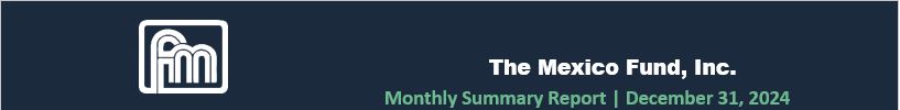 Global equity markets registered negative returns during December 2024. The MSCI World Index and the MSCI Emerging Markets Index decreased 2.7% and 0.3%, respectively, during the month. The Federal Reserve decreased its reference interest rate by 25 basis points to a range of 4.25% - 4.50%, while the European Central Bank decreased its main refinancing rate also by 25 basis points to 3.15%. On the other hand, the Bank of England maintained unchanged its reference interest rate at 4.75%. The DJIA and the S&P 500 decreased 5.3% and 2.5%, respectively, while the yield on the 10-year Treasury note increased 40 basis points to 4.57% and the U.S. dollar appreciated 2.6% (measured by the DXY Index5) during December 2024. In Mexico, the MSCI Mexico Index decreased 2.5% and the Mexican peso depreciated 2.2% during the month, to Ps. $20.83, whereas the Fund’s NAV decreased 1.3%, outperforming its benchmark.