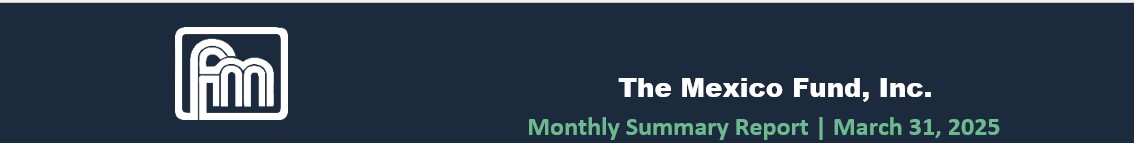 Global equity markets registered mixed returns during March 2025. The MSCI World Index decreased 4.6%, while the MSCI Emerging Markets Index increased 0.4% during the month. U.S. tariff announcements mentioned below have been the major driver for recent market behavior. On global monetary policy, both the Federal Reserve and the Bank of England maintained unchanged their target interest rates at a range of between 4.25% and 4.50% and at 4.50%, respectively, while the European Central Bank decreased its main refinancing rate by 25 basis points to 2.65%.The DJIA and the S&P 500 decreased 4.2% and 5.8%, respectively, while the yield on the 10-year Treasury note was unchanged at 4.21% and the U.S. dollar depreciated 3.2% (measured by the DXY Index5) during March 2025. In Mexico, the MSCI Mexico Index increased 1.4% and the Mexican peso appreciated 0.4% during the month, to Ps. $20.47, whereas the Fund’s NAV increased 0.8%, underperforming its benchmark.