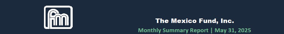 Global equity markets registered positive returns during May 2025. The MSCI World Index and the MSCI Emerging Markets Index increased by 5.7% and 4.0%, respectively, during the month. On global monetary policy, the Federal Reserve maintained its overnight interest rate unchanged at a range between 4.25% and 4.50%, while the Bank of England decreased its target interest rate by 25 basis points to 4.25%. The DJIA and the S&P 500 increased 3.9% and 6.2%, respectively, while the yield on the 10-year Treasury note increased 24 basis points to 4.40% and the U.S. dollar depreciated 0.1% (measured by the DXY Index5) during May 2025. In Mexico, the MSCI Mexico Index increased 4.4% and the Mexican peso appreciated 0.9% during the month, to Ps. $19.44, whereas the Fund’s NAV increased 5.5%, outperforming its benchmark.