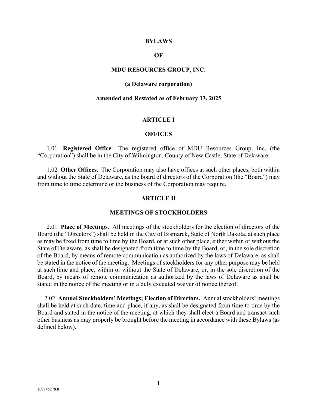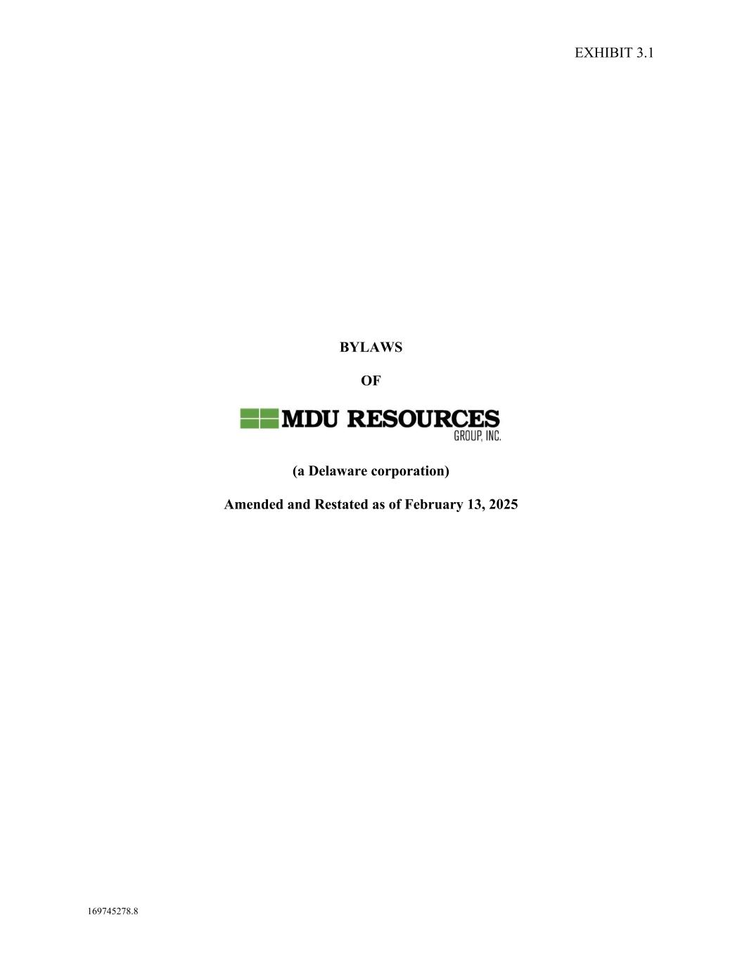 1 169745278.8 BYLAWS OF MDU RESOURCES GROUP, INC. (a Delaware corporation) Amended and Restated as of February 13, 2025 ARTICLE I OFFICES 1.01 Registered Office. The registered office of MDU Resources Group, Inc. (the “Corporation”) shall be in the City of Wilmington, County of New Castle, State of Delaware. 1.02 Other Offices. The Corporation may also have offices at such other places, both within and without the State of Delaware, as the board of directors of the Corporation (the “Board”) may from time to time determine or the business of the Corporation may require. ARTICLE II MEETINGS OF STOCKHOLDERS 2.01 Place of Meetings. All meetings of the stockholders for the election of directors of the Board (the “Directors”) shall be held in the City of Bismarck, State of North Dakota, at such place as may be fixed from time to time by the Board, or at such other place, either within or without the State of Delaware, as shall be designated from time to time by the Board, or, in the sole discretion of the Board, by means of remote communication as authorized by the laws of Delaware, as shall be stated in the notice of the meeting. Meetings of stockholders for any other purpose may be held at such time and place, within or without the State of Delaware, or, in the sole discretion of the Board, by means of remote communication as authorized by the laws of Delaware as shall be stated in the notice of the meeting or in a duly executed waiver of notice thereof. 2.02 Annual Stockholders’ Meetings; Election of Directors. Annual stockholders’ meetings shall be held at such date, time and place, if any, as shall be designated from time to time by the Board and stated in the notice of the meeting, at which they shall elect a Board and transact such other business as may properly be brought before the meeting in accordance with these Bylaws (as defined below).