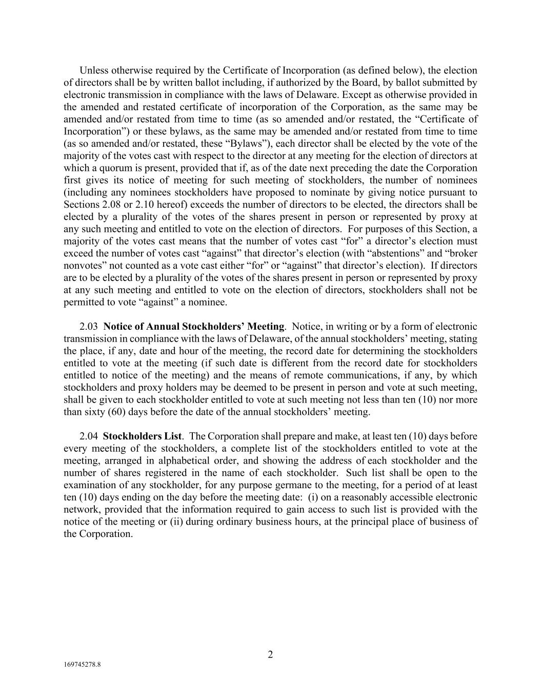 2 169745278.8 Unless otherwise required by the Certificate of Incorporation (as defined below), the election of directors shall be by written ballot including, if authorized by the Board, by ballot submitted by electronic transmission in compliance with the laws of Delaware. Except as otherwise provided in the amended and restated certificate of incorporation of the Corporation, as the same may be amended and/or restated from time to time (as so amended and/or restated, the “Certificate of Incorporation”) or these bylaws, as the same may be amended and/or restated from time to time (as so amended and/or restated, these “Bylaws”), each director shall be elected by the vote of the majority of the votes cast with respect to the director at any meeting for the election of directors at which a quorum is present, provided that if, as of the date next preceding the date the Corporation first gives its notice of meeting for such meeting of stockholders, the number of nominees (including any nominees stockholders have proposed to nominate by giving notice pursuant to Sections 2.08 or 2.10 hereof) exceeds the number of directors to be elected, the directors shall be elected by a plurality of the votes of the shares present in person or represented by proxy at any such meeting and entitled to vote on the election of directors. For purposes of this Section, a majority of the votes cast means that the number of votes cast “for” a director’s election must exceed the number of votes cast “against” that director’s election (with “abstentions” and “broker nonvotes” not counted as a vote cast either “for” or “against” that director’s election). If directors are to be elected by a plurality of the votes of the shares present in person or represented by proxy at any such meeting and entitled to vote on the election of directors, stockholders shall not be permitted to vote “against” a nominee. 2.03 Notice of Annual Stockholders’ Meeting. Notice, in writing or by a form of electronic transmission in compliance with the laws of Delaware, of the annual stockholders’ meeting, stating the place, if any, date and hour of the meeting, the record date for determining the stockholders entitled to vote at the meeting (if such date is different from the record date for stockholders entitled to notice of the meeting) and the means of remote communications, if any, by which stockholders and proxy holders may be deemed to be present in person and vote at such meeting, shall be given to each stockholder entitled to vote at such meeting not less than ten (10) nor more than sixty (60) days before the date of the annual stockholders’ meeting. 2.04 Stockholders List. The Corporation shall prepare and make, at least ten (10) days before every meeting of the stockholders, a complete list of the stockholders entitled to vote at the meeting, arranged in alphabetical order, and showing the address of each stockholder and the number of shares registered in the name of each stockholder. Such list shall be open to the examination of any stockholder, for any purpose germane to the meeting, for a period of at least ten (10) days ending on the day before the meeting date: (i) on a reasonably accessible electronic network, provided that the information required to gain access to such list is provided with the notice of the meeting or (ii) during ordinary business hours, at the principal place of business of the Corporation.