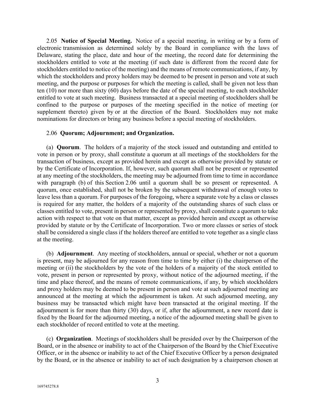 3 169745278.8 2.05 Notice of Special Meeting. Notice of a special meeting, in writing or by a form of electronic transmission as determined solely by the Board in compliance with the laws of Delaware, stating the place, date and hour of the meeting, the record date for determining the stockholders entitled to vote at the meeting (if such date is different from the record date for stockholders entitled to notice of the meeting) and the means of remote communications, if any, by which the stockholders and proxy holders may be deemed to be present in person and vote at such meeting, and the purpose or purposes for which the meeting is called, shall be given not less than ten (10) nor more than sixty (60) days before the date of the special meeting, to each stockholder entitled to vote at such meeting. Business transacted at a special meeting of stockholders shall be confined to the purpose or purposes of the meeting specified in the notice of meeting (or supplement thereto) given by or at the direction of the Board. Stockholders may not make nominations for directors or bring any business before a special meeting of stockholders. 2.06 Quorum; Adjournment; and Organization. (a) Quorum. The holders of a majority of the stock issued and outstanding and entitled to vote in person or by proxy, shall constitute a quorum at all meetings of the stockholders for the transaction of business, except as provided herein and except as otherwise provided by statute or by the Certificate of Incorporation. If, however, such quorum shall not be present or represented at any meeting of the stockholders, the meeting may be adjourned from time to time in accordance with paragraph (b) of this Section 2.06 until a quorum shall be so present or represented. A quorum, once established, shall not be broken by the subsequent withdrawal of enough votes to leave less than a quorum. For purposes of the foregoing, where a separate vote by a class or classes is required for any matter, the holders of a majority of the outstanding shares of such class or classes entitled to vote, present in person or represented by proxy, shall constitute a quorum to take action with respect to that vote on that matter, except as provided herein and except as otherwise provided by statute or by the Certificate of Incorporation. Two or more classes or series of stock shall be considered a single class if the holders thereof are entitled to vote together as a single class at the meeting. (b) Adjournment. Any meeting of stockholders, annual or special, whether or not a quorum is present, may be adjourned for any reason from time to time by either (i) the chairperson of the meeting or (ii) the stockholders by the vote of the holders of a majority of the stock entitled to vote, present in person or represented by proxy, without notice of the adjourned meeting, if the time and place thereof, and the means of remote communications, if any, by which stockholders and proxy holders may be deemed to be present in person and vote at such adjourned meeting are announced at the meeting at which the adjournment is taken. At such adjourned meeting, any business may be transacted which might have been transacted at the original meeting. If the adjournment is for more than thirty (30) days, or if, after the adjournment, a new record date is fixed by the Board for the adjourned meeting, a notice of the adjourned meeting shall be given to each stockholder of record entitled to vote at the meeting. (c) Organization. Meetings of stockholders shall be presided over by the Chairperson of the Board, or in the absence or inability to act of the Chairperson of the Board by the Chief Executive Officer, or in the absence or inability to act of the Chief Executive Officer by a person designated by the Board, or in the absence or inability to act of such designation by a chairperson chosen at