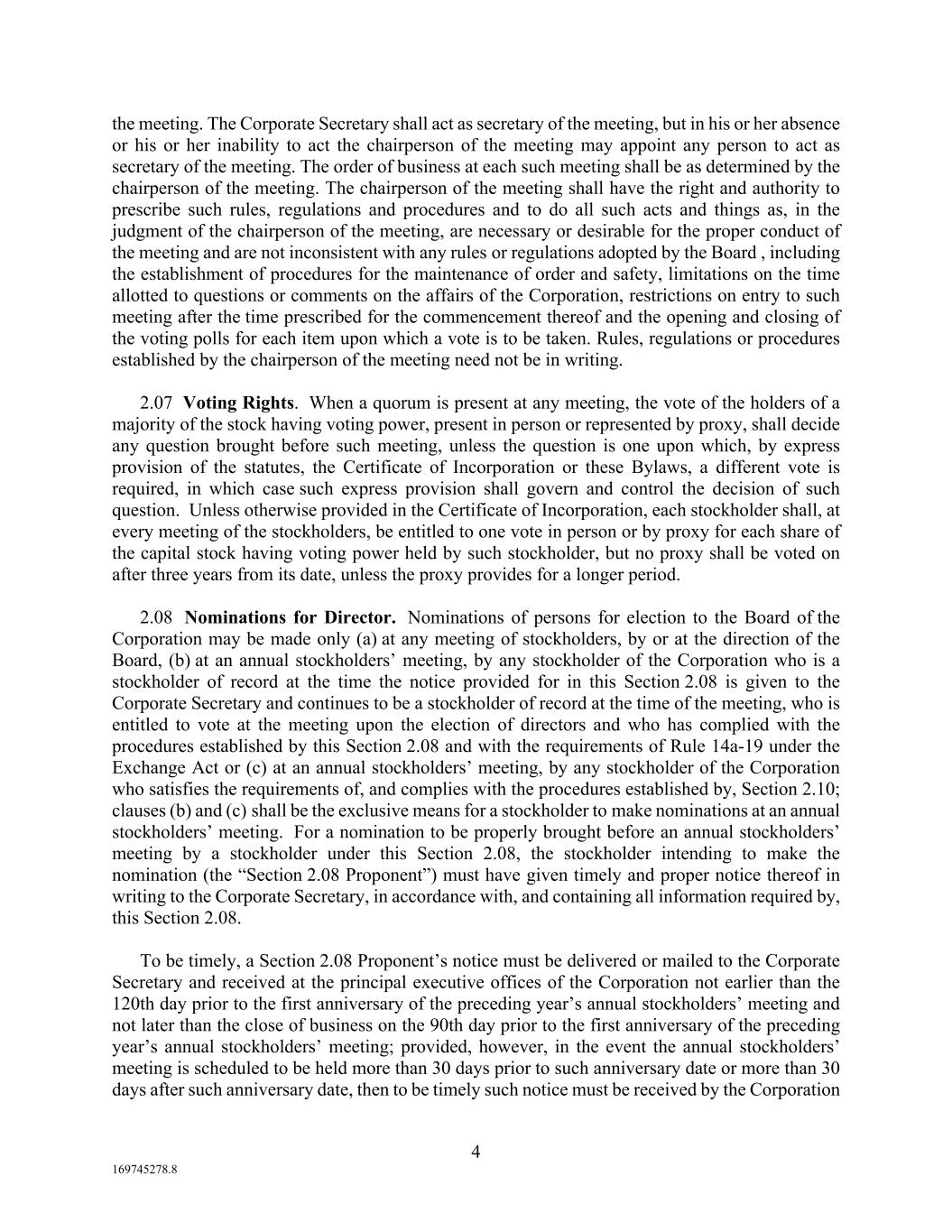 4 169745278.8 the meeting. The Corporate Secretary shall act as secretary of the meeting, but in his or her absence or his or her inability to act the chairperson of the meeting may appoint any person to act as secretary of the meeting. The order of business at each such meeting shall be as determined by the chairperson of the meeting. The chairperson of the meeting shall have the right and authority to prescribe such rules, regulations and procedures and to do all such acts and things as, in the judgment of the chairperson of the meeting, are necessary or desirable for the proper conduct of the meeting and are not inconsistent with any rules or regulations adopted by the Board , including the establishment of procedures for the maintenance of order and safety, limitations on the time allotted to questions or comments on the affairs of the Corporation, restrictions on entry to such meeting after the time prescribed for the commencement thereof and the opening and closing of the voting polls for each item upon which a vote is to be taken. Rules, regulations or procedures established by the chairperson of the meeting need not be in writing. 2.07 Voting Rights. When a quorum is present at any meeting, the vote of the holders of a majority of the stock having voting power, present in person or represented by proxy, shall decide any question brought before such meeting, unless the question is one upon which, by express provision of the statutes, the Certificate of Incorporation or these Bylaws, a different vote is required, in which case such express provision shall govern and control the decision of such question. Unless otherwise provided in the Certificate of Incorporation, each stockholder shall, at every meeting of the stockholders, be entitled to one vote in person or by proxy for each share of the capital stock having voting power held by such stockholder, but no proxy shall be voted on after three years from its date, unless the proxy provides for a longer period. 2.08 Nominations for Director. Nominations of persons for election to the Board of the Corporation may be made only (a) at any meeting of stockholders, by or at the direction of the Board, (b) at an annual stockholders’ meeting, by any stockholder of the Corporation who is a stockholder of record at the time the notice provided for in this Section 2.08 is given to the Corporate Secretary and continues to be a stockholder of record at the time of the meeting, who is entitled to vote at the meeting upon the election of directors and who has complied with the procedures established by this Section 2.08 and with the requirements of Rule 14a-19 under the Exchange Act or (c) at an annual stockholders’ meeting, by any stockholder of the Corporation who satisfies the requirements of, and complies with the procedures established by, Section 2.10; clauses (b) and (c) shall be the exclusive means for a stockholder to make nominations at an annual stockholders’ meeting. For a nomination to be properly brought before an annual stockholders’ meeting by a stockholder under this Section 2.08, the stockholder intending to make the nomination (the “Section 2.08 Proponent”) must have given timely and proper notice thereof in writing to the Corporate Secretary, in accordance with, and containing all information required by, this Section 2.08. To be timely, a Section 2.08 Proponent’s notice must be delivered or mailed to the Corporate Secretary and received at the principal executive offices of the Corporation not earlier than the 120th day prior to the first anniversary of the preceding year’s annual stockholders’ meeting and not later than the close of business on the 90th day prior to the first anniversary of the preceding year’s annual stockholders’ meeting; provided, however, in the event the annual stockholders’ meeting is scheduled to be held more than 30 days prior to such anniversary date or more than 30 days after such anniversary date, then to be timely such notice must be received by the Corporation