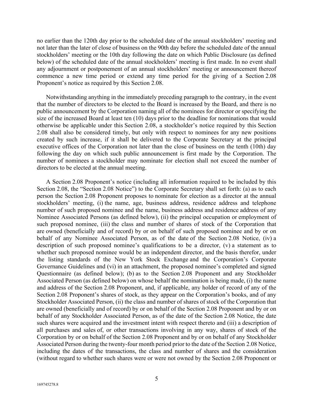 5 169745278.8 no earlier than the 120th day prior to the scheduled date of the annual stockholders’ meeting and not later than the later of close of business on the 90th day before the scheduled date of the annual stockholders’ meeting or the 10th day following the date on which Public Disclosure (as defined below) of the scheduled date of the annual stockholders’ meeting is first made. In no event shall any adjournment or postponement of an annual stockholders’ meeting or announcement thereof commence a new time period or extend any time period for the giving of a Section 2.08 Proponent’s notice as required by this Section 2.08. Notwithstanding anything in the immediately preceding paragraph to the contrary, in the event that the number of directors to be elected to the Board is increased by the Board, and there is no public announcement by the Corporation naming all of the nominees for director or specifying the size of the increased Board at least ten (10) days prior to the deadline for nominations that would otherwise be applicable under this Section 2.08, a stockholder’s notice required by this Section 2.08 shall also be considered timely, but only with respect to nominees for any new positions created by such increase, if it shall be delivered to the Corporate Secretary at the principal executive offices of the Corporation not later than the close of business on the tenth (10th) day following the day on which such public announcement is first made by the Corporation. The number of nominees a stockholder may nominate for election shall not exceed the number of directors to be elected at the annual meeting. A Section 2.08 Proponent’s notice (including all information required to be included by this Section 2.08, the “Section 2.08 Notice”) to the Corporate Secretary shall set forth: (a) as to each person the Section 2.08 Proponent proposes to nominate for election as a director at the annual stockholders’ meeting, (i) the name, age, business address, residence address and telephone number of such proposed nominee and the name, business address and residence address of any Nominee Associated Persons (as defined below), (ii) the principal occupation or employment of such proposed nominee, (iii) the class and number of shares of stock of the Corporation that are owned (beneficially and of record) by or on behalf of such proposed nominee and by or on behalf of any Nominee Associated Person, as of the date of the Section 2.08 Notice, (iv) a description of such proposed nominee’s qualifications to be a director, (v) a statement as to whether such proposed nominee would be an independent director, and the basis therefor, under the listing standards of the New York Stock Exchange and the Corporation’s Corporate Governance Guidelines and (vi) in an attachment, the proposed nominee’s completed and signed Questionnaire (as defined below); (b) as to the Section 2.08 Proponent and any Stockholder Associated Person (as defined below) on whose behalf the nomination is being made, (i) the name and address of the Section 2.08 Proponent, and, if applicable, any holder of record of any of the Section 2.08 Proponent’s shares of stock, as they appear on the Corporation’s books, and of any Stockholder Associated Person, (ii) the class and number of shares of stock of the Corporation that are owned (beneficially and of record) by or on behalf of the Section 2.08 Proponent and by or on behalf of any Stockholder Associated Person, as of the date of the Section 2.08 Notice, the date such shares were acquired and the investment intent with respect thereto and (iii) a description of all purchases and sales of, or other transactions involving in any way, shares of stock of the Corporation by or on behalf of the Section 2.08 Proponent and by or on behalf of any Stockholder Associated Person during the twenty-four month period prior to the date of the Section 2.08 Notice, including the dates of the transactions, the class and number of shares and the consideration (without regard to whether such shares were or were not owned by the Section 2.08 Proponent or