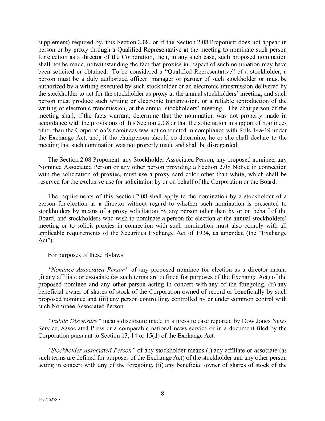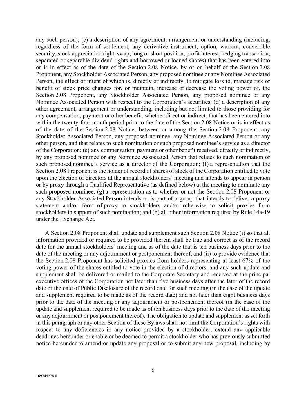 6 169745278.8 any such person); (c) a description of any agreement, arrangement or understanding (including, regardless of the form of settlement, any derivative instrument, option, warrant, convertible security, stock appreciation right, swap, long or short position, profit interest, hedging transaction, separated or separable dividend rights and borrowed or loaned shares) that has been entered into or is in effect as of the date of the Section 2.08 Notice, by or on behalf of the Section 2.08 Proponent, any Stockholder Associated Person, any proposed nominee or any Nominee Associated Person, the effect or intent of which is, directly or indirectly, to mitigate loss to, manage risk or benefit of stock price changes for, or maintain, increase or decrease the voting power of, the Section 2.08 Proponent, any Stockholder Associated Person, any proposed nominee or any Nominee Associated Person with respect to the Corporation’s securities; (d) a description of any other agreement, arrangement or understanding, including but not limited to those providing for any compensation, payment or other benefit, whether direct or indirect, that has been entered into within the twenty-four month period prior to the date of the Section 2.08 Notice or is in effect as of the date of the Section 2.08 Notice, between or among the Section 2.08 Proponent, any Stockholder Associated Person, any proposed nominee, any Nominee Associated Person or any other person, and that relates to such nomination or such proposed nominee’s service as a director of the Corporation; (e) any compensation, payment or other benefit received, directly or indirectly, by any proposed nominee or any Nominee Associated Person that relates to such nomination or such proposed nominee’s service as a director of the Corporation; (f) a representation that the Section 2.08 Proponent is the holder of record of shares of stock of the Corporation entitled to vote upon the election of directors at the annual stockholders’ meeting and intends to appear in person or by proxy through a Qualified Representative (as defined below) at the meeting to nominate any such proposed nominee; (g) a representation as to whether or not the Section 2.08 Proponent or any Stockholder Associated Person intends or is part of a group that intends to deliver a proxy statement and/or form of proxy to stockholders and/or otherwise to solicit proxies from stockholders in support of such nomination; and (h) all other information required by Rule 14a-19 under the Exchange Act. A Section 2.08 Proponent shall update and supplement such Section 2.08 Notice (i) so that all information provided or required to be provided therein shall be true and correct as of the record date for the annual stockholders’ meeting and as of the date that is ten business days prior to the date of the meeting or any adjournment or postponement thereof, and (ii) to provide evidence that the Section 2.08 Proponent has solicited proxies from holders representing at least 67% of the voting power of the shares entitled to vote in the election of directors, and any such update and supplement shall be delivered or mailed to the Corporate Secretary and received at the principal executive offices of the Corporation not later than five business days after the later of the record date or the date of Public Disclosure of the record date for such meeting (in the case of the update and supplement required to be made as of the record date) and not later than eight business days prior to the date of the meeting or any adjournment or postponement thereof (in the case of the update and supplement required to be made as of ten business days prior to the date of the meeting or any adjournment or postponement thereof). The obligation to update and supplement as set forth in this paragraph or any other Section of these Bylaws shall not limit the Corporation’s rights with respect to any deficiencies in any notice provided by a stockholder, extend any applicable deadlines hereunder or enable or be deemed to permit a stockholder who has previously submitted notice hereunder to amend or update any proposal or to submit any new proposal, including by