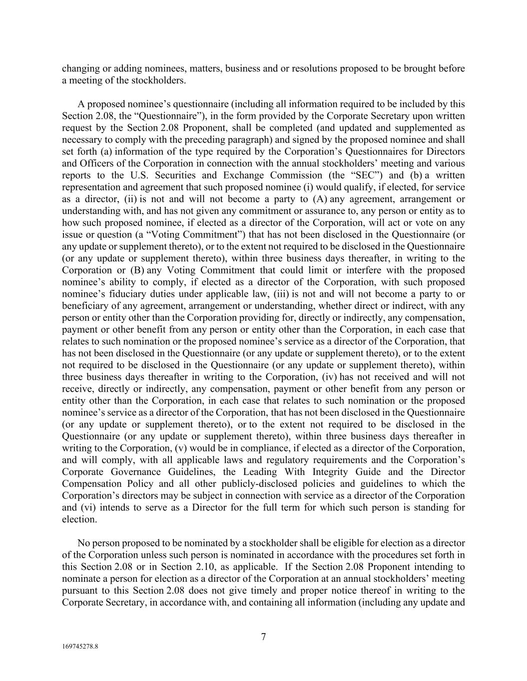 7 169745278.8 changing or adding nominees, matters, business and or resolutions proposed to be brought before a meeting of the stockholders. A proposed nominee’s questionnaire (including all information required to be included by this Section 2.08, the “Questionnaire”), in the form provided by the Corporate Secretary upon written request by the Section 2.08 Proponent, shall be completed (and updated and supplemented as necessary to comply with the preceding paragraph) and signed by the proposed nominee and shall set forth (a) information of the type required by the Corporation’s Questionnaires for Directors and Officers of the Corporation in connection with the annual stockholders’ meeting and various reports to the U.S. Securities and Exchange Commission (the “SEC”) and (b) a written representation and agreement that such proposed nominee (i) would qualify, if elected, for service as a director, (ii) is not and will not become a party to (A) any agreement, arrangement or understanding with, and has not given any commitment or assurance to, any person or entity as to how such proposed nominee, if elected as a director of the Corporation, will act or vote on any issue or question (a “Voting Commitment”) that has not been disclosed in the Questionnaire (or any update or supplement thereto), or to the extent not required to be disclosed in the Questionnaire (or any update or supplement thereto), within three business days thereafter, in writing to the Corporation or (B) any Voting Commitment that could limit or interfere with the proposed nominee’s ability to comply, if elected as a director of the Corporation, with such proposed nominee’s fiduciary duties under applicable law, (iii) is not and will not become a party to or beneficiary of any agreement, arrangement or understanding, whether direct or indirect, with any person or entity other than the Corporation providing for, directly or indirectly, any compensation, payment or other benefit from any person or entity other than the Corporation, in each case that relates to such nomination or the proposed nominee’s service as a director of the Corporation, that has not been disclosed in the Questionnaire (or any update or supplement thereto), or to the extent not required to be disclosed in the Questionnaire (or any update or supplement thereto), within three business days thereafter in writing to the Corporation, (iv) has not received and will not receive, directly or indirectly, any compensation, payment or other benefit from any person or entity other than the Corporation, in each case that relates to such nomination or the proposed nominee’s service as a director of the Corporation, that has not been disclosed in the Questionnaire (or any update or supplement thereto), or to the extent not required to be disclosed in the Questionnaire (or any update or supplement thereto), within three business days thereafter in writing to the Corporation, (v) would be in compliance, if elected as a director of the Corporation, and will comply, with all applicable laws and regulatory requirements and the Corporation’s Corporate Governance Guidelines, the Leading With Integrity Guide and the Director Compensation Policy and all other publicly-disclosed policies and guidelines to which the Corporation’s directors may be subject in connection with service as a director of the Corporation and (vi) intends to serve as a Director for the full term for which such person is standing for election. No person proposed to be nominated by a stockholder shall be eligible for election as a director of the Corporation unless such person is nominated in accordance with the procedures set forth in this Section 2.08 or in Section 2.10, as applicable. If the Section 2.08 Proponent intending to nominate a person for election as a director of the Corporation at an annual stockholders’ meeting pursuant to this Section 2.08 does not give timely and proper notice thereof in writing to the Corporate Secretary, in accordance with, and containing all information (including any update and