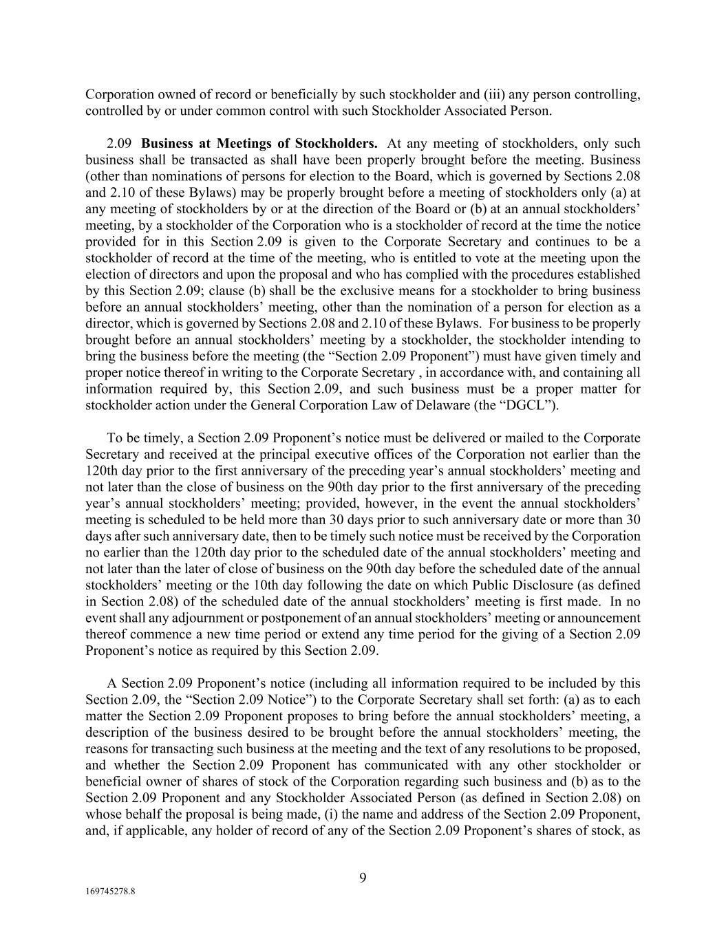 9 169745278.8 Corporation owned of record or beneficially by such stockholder and (iii) any person controlling, controlled by or under common control with such Stockholder Associated Person. 2.09 Business at Meetings of Stockholders. At any meeting of stockholders, only such business shall be transacted as shall have been properly brought before the meeting. Business (other than nominations of persons for election to the Board, which is governed by Sections 2.08 and 2.10 of these Bylaws) may be properly brought before a meeting of stockholders only (a) at any meeting of stockholders by or at the direction of the Board or (b) at an annual stockholders’ meeting, by a stockholder of the Corporation who is a stockholder of record at the time the notice provided for in this Section 2.09 is given to the Corporate Secretary and continues to be a stockholder of record at the time of the meeting, who is entitled to vote at the meeting upon the election of directors and upon the proposal and who has complied with the procedures established by this Section 2.09; clause (b) shall be the exclusive means for a stockholder to bring business before an annual stockholders’ meeting, other than the nomination of a person for election as a director, which is governed by Sections 2.08 and 2.10 of these Bylaws. For business to be properly brought before an annual stockholders’ meeting by a stockholder, the stockholder intending to bring the business before the meeting (the “Section 2.09 Proponent”) must have given timely and proper notice thereof in writing to the Corporate Secretary , in accordance with, and containing all information required by, this Section 2.09, and such business must be a proper matter for stockholder action under the General Corporation Law of Delaware (the “DGCL”). To be timely, a Section 2.09 Proponent’s notice must be delivered or mailed to the Corporate Secretary and received at the principal executive offices of the Corporation not earlier than the 120th day prior to the first anniversary of the preceding year’s annual stockholders’ meeting and not later than the close of business on the 90th day prior to the first anniversary of the preceding year’s annual stockholders’ meeting; provided, however, in the event the annual stockholders’ meeting is scheduled to be held more than 30 days prior to such anniversary date or more than 30 days after such anniversary date, then to be timely such notice must be received by the Corporation no earlier than the 120th day prior to the scheduled date of the annual stockholders’ meeting and not later than the later of close of business on the 90th day before the scheduled date of the annual stockholders’ meeting or the 10th day following the date on which Public Disclosure (as defined in Section 2.08) of the scheduled date of the annual stockholders’ meeting is first made. In no event shall any adjournment or postponement of an annual stockholders’ meeting or announcement thereof commence a new time period or extend any time period for the giving of a Section 2.09 Proponent’s notice as required by this Section 2.09. A Section 2.09 Proponent’s notice (including all information required to be included by this Section 2.09, the “Section 2.09 Notice”) to the Corporate Secretary shall set forth: (a) as to each matter the Section 2.09 Proponent proposes to bring before the annual stockholders’ meeting, a description of the business desired to be brought before the annual stockholders’ meeting, the reasons for transacting such business at the meeting and the text of any resolutions to be proposed, and whether the Section 2.09 Proponent has communicated with any other stockholder or beneficial owner of shares of stock of the Corporation regarding such business and (b) as to the Section 2.09 Proponent and any Stockholder Associated Person (as defined in Section 2.08) on whose behalf the proposal is being made, (i) the name and address of the Section 2.09 Proponent, and, if applicable, any holder of record of any of the Section 2.09 Proponent’s shares of stock, as