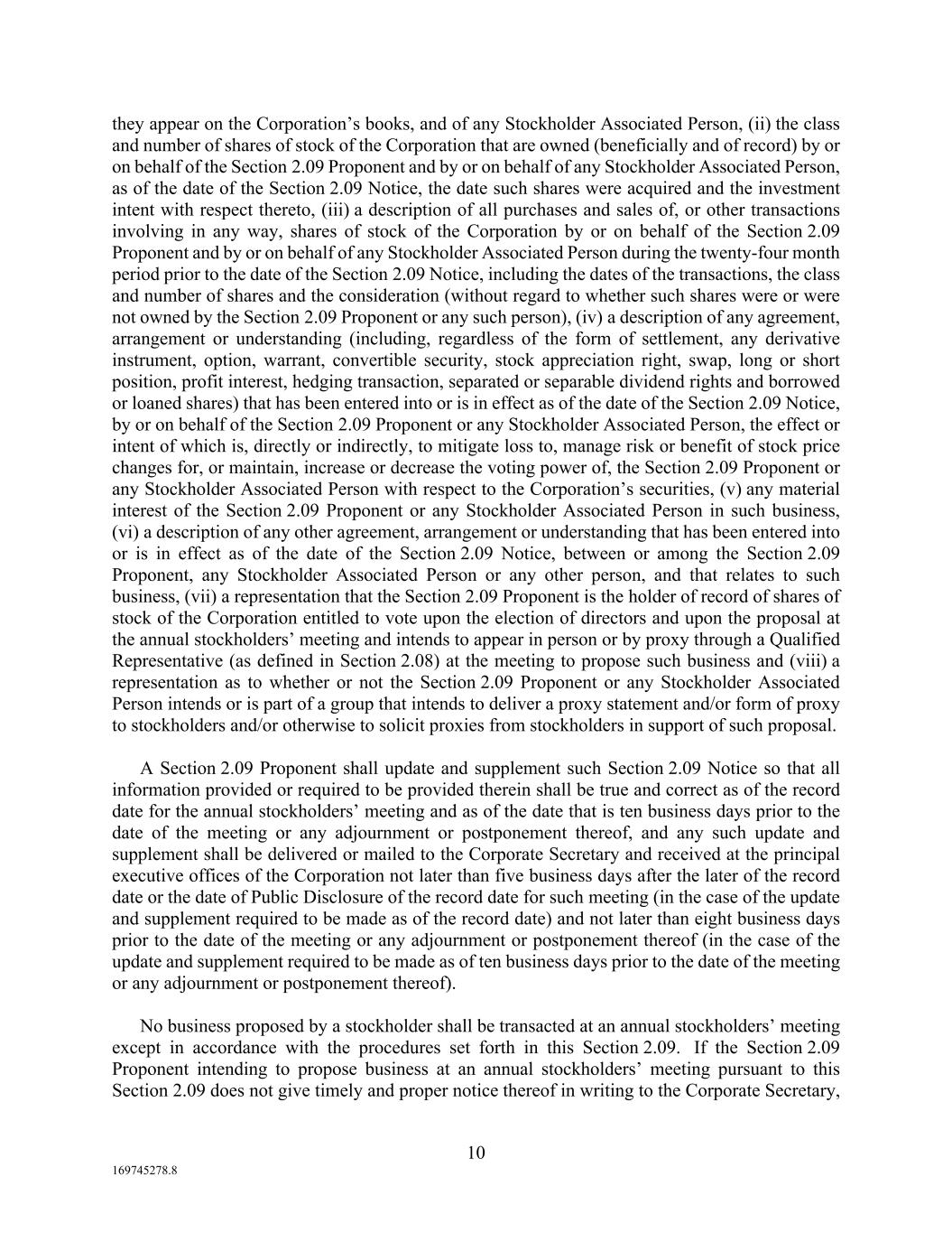 10 169745278.8 they appear on the Corporation’s books, and of any Stockholder Associated Person, (ii) the class and number of shares of stock of the Corporation that are owned (beneficially and of record) by or on behalf of the Section 2.09 Proponent and by or on behalf of any Stockholder Associated Person, as of the date of the Section 2.09 Notice, the date such shares were acquired and the investment intent with respect thereto, (iii) a description of all purchases and sales of, or other transactions involving in any way, shares of stock of the Corporation by or on behalf of the Section 2.09 Proponent and by or on behalf of any Stockholder Associated Person during the twenty-four month period prior to the date of the Section 2.09 Notice, including the dates of the transactions, the class and number of shares and the consideration (without regard to whether such shares were or were not owned by the Section 2.09 Proponent or any such person), (iv) a description of any agreement, arrangement or understanding (including, regardless of the form of settlement, any derivative instrument, option, warrant, convertible security, stock appreciation right, swap, long or short position, profit interest, hedging transaction, separated or separable dividend rights and borrowed or loaned shares) that has been entered into or is in effect as of the date of the Section 2.09 Notice, by or on behalf of the Section 2.09 Proponent or any Stockholder Associated Person, the effect or intent of which is, directly or indirectly, to mitigate loss to, manage risk or benefit of stock price changes for, or maintain, increase or decrease the voting power of, the Section 2.09 Proponent or any Stockholder Associated Person with respect to the Corporation’s securities, (v) any material interest of the Section 2.09 Proponent or any Stockholder Associated Person in such business, (vi) a description of any other agreement, arrangement or understanding that has been entered into or is in effect as of the date of the Section 2.09 Notice, between or among the Section 2.09 Proponent, any Stockholder Associated Person or any other person, and that relates to such business, (vii) a representation that the Section 2.09 Proponent is the holder of record of shares of stock of the Corporation entitled to vote upon the election of directors and upon the proposal at the annual stockholders’ meeting and intends to appear in person or by proxy through a Qualified Representative (as defined in Section 2.08) at the meeting to propose such business and (viii) a representation as to whether or not the Section 2.09 Proponent or any Stockholder Associated Person intends or is part of a group that intends to deliver a proxy statement and/or form of proxy to stockholders and/or otherwise to solicit proxies from stockholders in support of such proposal. A Section 2.09 Proponent shall update and supplement such Section 2.09 Notice so that all information provided or required to be provided therein shall be true and correct as of the record date for the annual stockholders’ meeting and as of the date that is ten business days prior to the date of the meeting or any adjournment or postponement thereof, and any such update and supplement shall be delivered or mailed to the Corporate Secretary and received at the principal executive offices of the Corporation not later than five business days after the later of the record date or the date of Public Disclosure of the record date for such meeting (in the case of the update and supplement required to be made as of the record date) and not later than eight business days prior to the date of the meeting or any adjournment or postponement thereof (in the case of the update and supplement required to be made as of ten business days prior to the date of the meeting or any adjournment or postponement thereof). No business proposed by a stockholder shall be transacted at an annual stockholders’ meeting except in accordance with the procedures set forth in this Section 2.09. If the Section 2.09 Proponent intending to propose business at an annual stockholders’ meeting pursuant to this Section 2.09 does not give timely and proper notice thereof in writing to the Corporate Secretary,