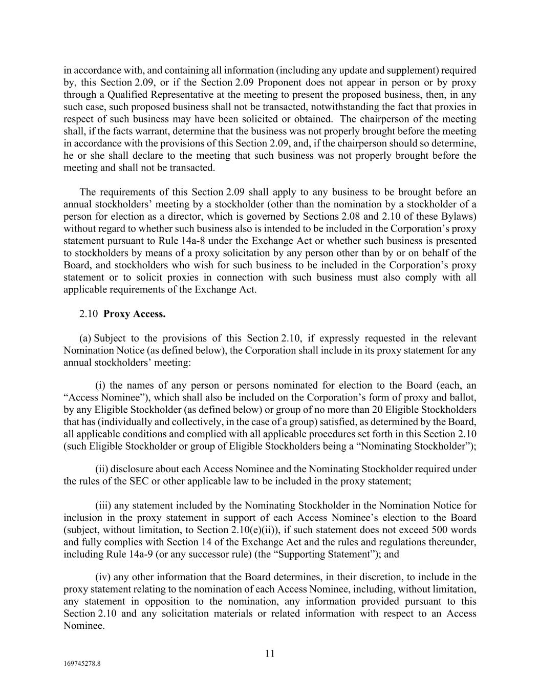 11 169745278.8 in accordance with, and containing all information (including any update and supplement) required by, this Section 2.09, or if the Section 2.09 Proponent does not appear in person or by proxy through a Qualified Representative at the meeting to present the proposed business, then, in any such case, such proposed business shall not be transacted, notwithstanding the fact that proxies in respect of such business may have been solicited or obtained. The chairperson of the meeting shall, if the facts warrant, determine that the business was not properly brought before the meeting in accordance with the provisions of this Section 2.09, and, if the chairperson should so determine, he or she shall declare to the meeting that such business was not properly brought before the meeting and shall not be transacted. The requirements of this Section 2.09 shall apply to any business to be brought before an annual stockholders’ meeting by a stockholder (other than the nomination by a stockholder of a person for election as a director, which is governed by Sections 2.08 and 2.10 of these Bylaws) without regard to whether such business also is intended to be included in the Corporation’s proxy statement pursuant to Rule 14a-8 under the Exchange Act or whether such business is presented to stockholders by means of a proxy solicitation by any person other than by or on behalf of the Board, and stockholders who wish for such business to be included in the Corporation’s proxy statement or to solicit proxies in connection with such business must also comply with all applicable requirements of the Exchange Act. 2.10 Proxy Access. (a) Subject to the provisions of this Section 2.10, if expressly requested in the relevant Nomination Notice (as defined below), the Corporation shall include in its proxy statement for any annual stockholders’ meeting: (i) the names of any person or persons nominated for election to the Board (each, an “Access Nominee”), which shall also be included on the Corporation’s form of proxy and ballot, by any Eligible Stockholder (as defined below) or group of no more than 20 Eligible Stockholders that has (individually and collectively, in the case of a group) satisfied, as determined by the Board, all applicable conditions and complied with all applicable procedures set forth in this Section 2.10 (such Eligible Stockholder or group of Eligible Stockholders being a “Nominating Stockholder”); (ii) disclosure about each Access Nominee and the Nominating Stockholder required under the rules of the SEC or other applicable law to be included in the proxy statement; (iii) any statement included by the Nominating Stockholder in the Nomination Notice for inclusion in the proxy statement in support of each Access Nominee’s election to the Board (subject, without limitation, to Section 2.10(e)(ii)), if such statement does not exceed 500 words and fully complies with Section 14 of the Exchange Act and the rules and regulations thereunder, including Rule 14a-9 (or any successor rule) (the “Supporting Statement”); and (iv) any other information that the Board determines, in their discretion, to include in the proxy statement relating to the nomination of each Access Nominee, including, without limitation, any statement in opposition to the nomination, any information provided pursuant to this Section 2.10 and any solicitation materials or related information with respect to an Access Nominee.