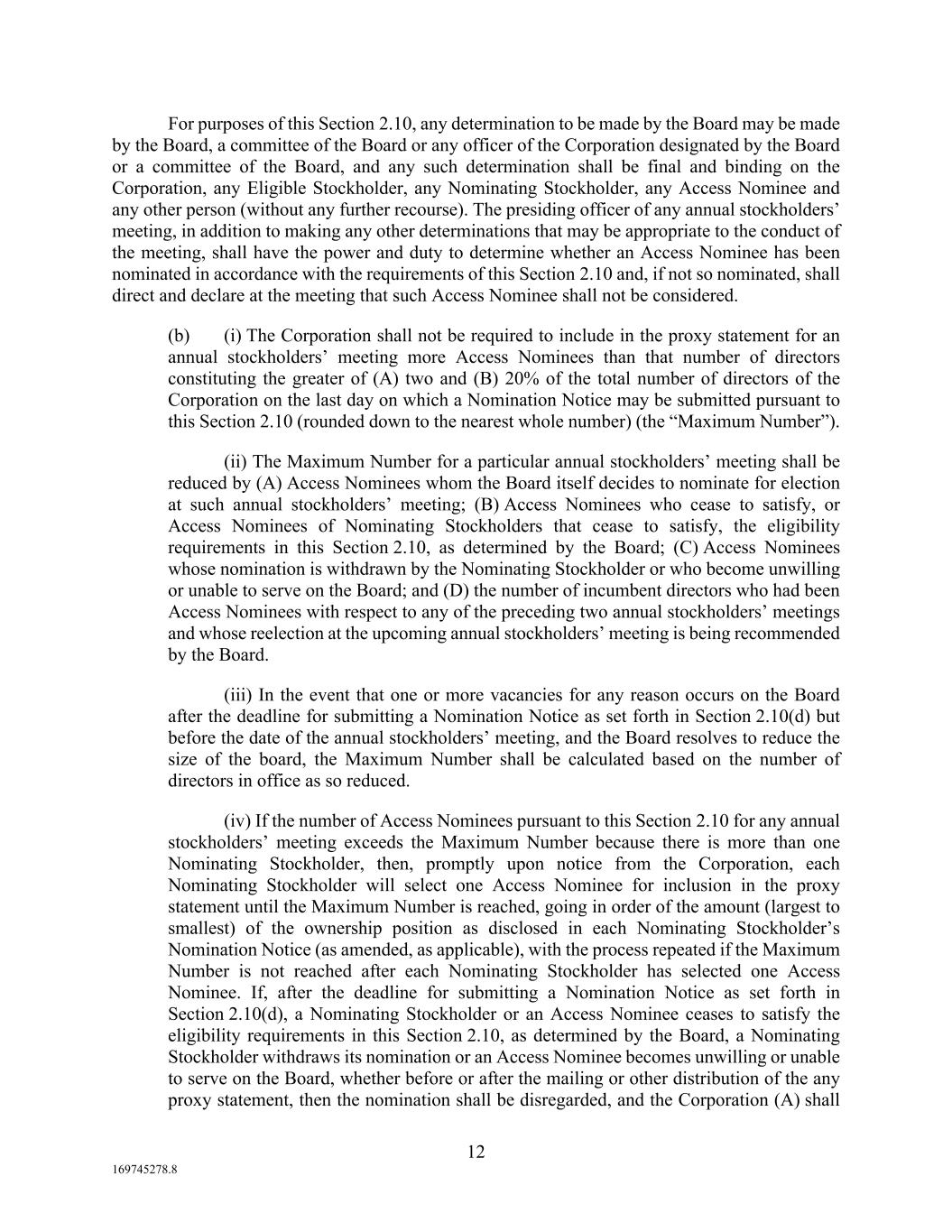 12 169745278.8 For purposes of this Section 2.10, any determination to be made by the Board may be made by the Board, a committee of the Board or any officer of the Corporation designated by the Board or a committee of the Board, and any such determination shall be final and binding on the Corporation, any Eligible Stockholder, any Nominating Stockholder, any Access Nominee and any other person (without any further recourse). The presiding officer of any annual stockholders’ meeting, in addition to making any other determinations that may be appropriate to the conduct of the meeting, shall have the power and duty to determine whether an Access Nominee has been nominated in accordance with the requirements of this Section 2.10 and, if not so nominated, shall direct and declare at the meeting that such Access Nominee shall not be considered. (b) (i) The Corporation shall not be required to include in the proxy statement for an annual stockholders’ meeting more Access Nominees than that number of directors constituting the greater of (A) two and (B) 20% of the total number of directors of the Corporation on the last day on which a Nomination Notice may be submitted pursuant to this Section 2.10 (rounded down to the nearest whole number) (the “Maximum Number”). (ii) The Maximum Number for a particular annual stockholders’ meeting shall be reduced by (A) Access Nominees whom the Board itself decides to nominate for election at such annual stockholders’ meeting; (B) Access Nominees who cease to satisfy, or Access Nominees of Nominating Stockholders that cease to satisfy, the eligibility requirements in this Section 2.10, as determined by the Board; (C) Access Nominees whose nomination is withdrawn by the Nominating Stockholder or who become unwilling or unable to serve on the Board; and (D) the number of incumbent directors who had been Access Nominees with respect to any of the preceding two annual stockholders’ meetings and whose reelection at the upcoming annual stockholders’ meeting is being recommended by the Board. (iii) In the event that one or more vacancies for any reason occurs on the Board after the deadline for submitting a Nomination Notice as set forth in Section 2.10(d) but before the date of the annual stockholders’ meeting, and the Board resolves to reduce the size of the board, the Maximum Number shall be calculated based on the number of directors in office as so reduced. (iv) If the number of Access Nominees pursuant to this Section 2.10 for any annual stockholders’ meeting exceeds the Maximum Number because there is more than one Nominating Stockholder, then, promptly upon notice from the Corporation, each Nominating Stockholder will select one Access Nominee for inclusion in the proxy statement until the Maximum Number is reached, going in order of the amount (largest to smallest) of the ownership position as disclosed in each Nominating Stockholder’s Nomination Notice (as amended, as applicable), with the process repeated if the Maximum Number is not reached after each Nominating Stockholder has selected one Access Nominee. If, after the deadline for submitting a Nomination Notice as set forth in Section 2.10(d), a Nominating Stockholder or an Access Nominee ceases to satisfy the eligibility requirements in this Section 2.10, as determined by the Board, a Nominating Stockholder withdraws its nomination or an Access Nominee becomes unwilling or unable to serve on the Board, whether before or after the mailing or other distribution of the any proxy statement, then the nomination shall be disregarded, and the Corporation (A) shall