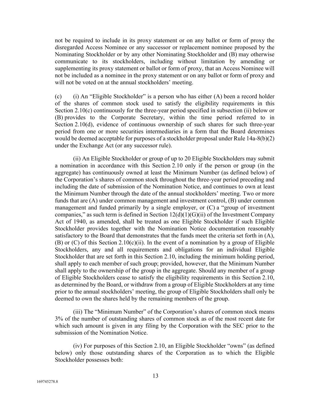 13 169745278.8 not be required to include in its proxy statement or on any ballot or form of proxy the disregarded Access Nominee or any successor or replacement nominee proposed by the Nominating Stockholder or by any other Nominating Stockholder and (B) may otherwise communicate to its stockholders, including without limitation by amending or supplementing its proxy statement or ballot or form of proxy, that an Access Nominee will not be included as a nominee in the proxy statement or on any ballot or form of proxy and will not be voted on at the annual stockholders’ meeting. (c) (i) An “Eligible Stockholder” is a person who has either (A) been a record holder of the shares of common stock used to satisfy the eligibility requirements in this Section 2.10(c) continuously for the three-year period specified in subsection (ii) below or (B) provides to the Corporate Secretary, within the time period referred to in Section 2.10(d), evidence of continuous ownership of such shares for such three-year period from one or more securities intermediaries in a form that the Board determines would be deemed acceptable for purposes of a stockholder proposal under Rule 14a-8(b)(2) under the Exchange Act (or any successor rule). (ii) An Eligible Stockholder or group of up to 20 Eligible Stockholders may submit a nomination in accordance with this Section 2.10 only if the person or group (in the aggregate) has continuously owned at least the Minimum Number (as defined below) of the Corporation’s shares of common stock throughout the three-year period preceding and including the date of submission of the Nomination Notice, and continues to own at least the Minimum Number through the date of the annual stockholders’ meeting. Two or more funds that are (A) under common management and investment control, (B) under common management and funded primarily by a single employer, or (C) a “group of investment companies,” as such term is defined in Section 12(d)(1)(G)(ii) of the Investment Company Act of 1940, as amended, shall be treated as one Eligible Stockholder if such Eligible Stockholder provides together with the Nomination Notice documentation reasonably satisfactory to the Board that demonstrates that the funds meet the criteria set forth in (A), (B) or (C) of this Section 2.10(c)(ii). In the event of a nomination by a group of Eligible Stockholders, any and all requirements and obligations for an individual Eligible Stockholder that are set forth in this Section 2.10, including the minimum holding period, shall apply to each member of such group; provided, however, that the Minimum Number shall apply to the ownership of the group in the aggregate. Should any member of a group of Eligible Stockholders cease to satisfy the eligibility requirements in this Section 2.10, as determined by the Board, or withdraw from a group of Eligible Stockholders at any time prior to the annual stockholders’ meeting, the group of Eligible Stockholders shall only be deemed to own the shares held by the remaining members of the group. (iii) The “Minimum Number” of the Corporation’s shares of common stock means 3% of the number of outstanding shares of common stock as of the most recent date for which such amount is given in any filing by the Corporation with the SEC prior to the submission of the Nomination Notice. (iv) For purposes of this Section 2.10, an Eligible Stockholder “owns” (as defined below) only those outstanding shares of the Corporation as to which the Eligible Stockholder possesses both: