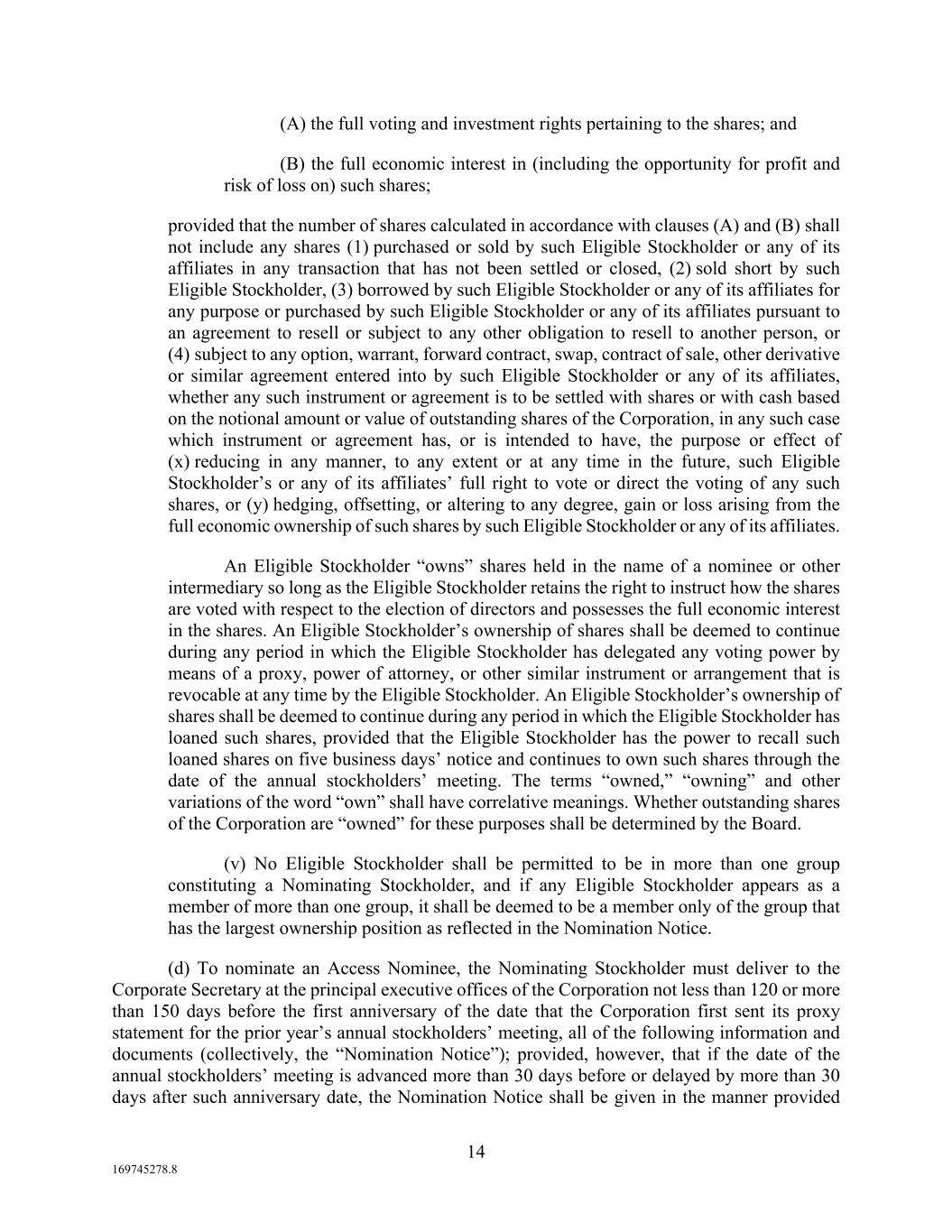14 169745278.8 (A) the full voting and investment rights pertaining to the shares; and (B) the full economic interest in (including the opportunity for profit and risk of loss on) such shares; provided that the number of shares calculated in accordance with clauses (A) and (B) shall not include any shares (1) purchased or sold by such Eligible Stockholder or any of its affiliates in any transaction that has not been settled or closed, (2) sold short by such Eligible Stockholder, (3) borrowed by such Eligible Stockholder or any of its affiliates for any purpose or purchased by such Eligible Stockholder or any of its affiliates pursuant to an agreement to resell or subject to any other obligation to resell to another person, or (4) subject to any option, warrant, forward contract, swap, contract of sale, other derivative or similar agreement entered into by such Eligible Stockholder or any of its affiliates, whether any such instrument or agreement is to be settled with shares or with cash based on the notional amount or value of outstanding shares of the Corporation, in any such case which instrument or agreement has, or is intended to have, the purpose or effect of (x) reducing in any manner, to any extent or at any time in the future, such Eligible Stockholder’s or any of its affiliates’ full right to vote or direct the voting of any such shares, or (y) hedging, offsetting, or altering to any degree, gain or loss arising from the full economic ownership of such shares by such Eligible Stockholder or any of its affiliates. An Eligible Stockholder “owns” shares held in the name of a nominee or other intermediary so long as the Eligible Stockholder retains the right to instruct how the shares are voted with respect to the election of directors and possesses the full economic interest in the shares. An Eligible Stockholder’s ownership of shares shall be deemed to continue during any period in which the Eligible Stockholder has delegated any voting power by means of a proxy, power of attorney, or other similar instrument or arrangement that is revocable at any time by the Eligible Stockholder. An Eligible Stockholder’s ownership of shares shall be deemed to continue during any period in which the Eligible Stockholder has loaned such shares, provided that the Eligible Stockholder has the power to recall such loaned shares on five business days’ notice and continues to own such shares through the date of the annual stockholders’ meeting. The terms “owned,” “owning” and other variations of the word “own” shall have correlative meanings. Whether outstanding shares of the Corporation are “owned” for these purposes shall be determined by the Board. (v) No Eligible Stockholder shall be permitted to be in more than one group constituting a Nominating Stockholder, and if any Eligible Stockholder appears as a member of more than one group, it shall be deemed to be a member only of the group that has the largest ownership position as reflected in the Nomination Notice. (d) To nominate an Access Nominee, the Nominating Stockholder must deliver to the Corporate Secretary at the principal executive offices of the Corporation not less than 120 or more than 150 days before the first anniversary of the date that the Corporation first sent its proxy statement for the prior year’s annual stockholders’ meeting, all of the following information and documents (collectively, the “Nomination Notice”); provided, however, that if the date of the annual stockholders’ meeting is advanced more than 30 days before or delayed by more than 30 days after such anniversary date, the Nomination Notice shall be given in the manner provided