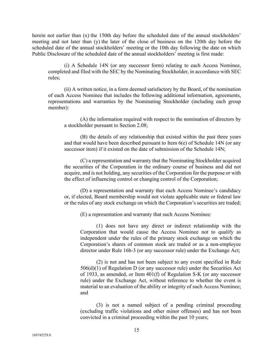 15 169745278.8 herein not earlier than (x) the 150th day before the scheduled date of the annual stockholders’ meeting and not later than (y) the later of the close of business on the 120th day before the scheduled date of the annual stockholders’ meeting or the 10th day following the date on which Public Disclosure of the scheduled date of the annual stockholders’ meeting is first made: (i) A Schedule 14N (or any successor form) relating to each Access Nominee, completed and filed with the SEC by the Nominating Stockholder, in accordance with SEC rules; (ii) A written notice, in a form deemed satisfactory by the Board, of the nomination of each Access Nominee that includes the following additional information, agreements, representations and warranties by the Nominating Stockholder (including each group member): (A) the information required with respect to the nomination of directors by a stockholder pursuant to Section 2.08; (B) the details of any relationship that existed within the past three years and that would have been described pursuant to Item 6(e) of Schedule 14N (or any successor item) if it existed on the date of submission of the Schedule 14N; (C) a representation and warranty that the Nominating Stockholder acquired the securities of the Corporation in the ordinary course of business and did not acquire, and is not holding, any securities of the Corporation for the purpose or with the effect of influencing control or changing control of the Corporation; (D) a representation and warranty that each Access Nominee’s candidacy or, if elected, Board membership would not violate applicable state or federal law or the rules of any stock exchange on which the Corporation’s securities are traded; (E) a representation and warranty that such Access Nominee: (1) does not have any direct or indirect relationship with the Corporation that would cause the Access Nominee not to qualify as independent under the rules of the primary stock exchange on which the Corporation’s shares of common stock are traded or as a non-employee director under Rule 16b-3 (or any successor rule) under the Exchange Act; (2) is not and has not been subject to any event specified in Rule 506(d)(1) of Regulation D (or any successor rule) under the Securities Act of 1933, as amended, or Item 401(f) of Regulation S-K (or any successor rule) under the Exchange Act, without reference to whether the event is material to an evaluation of the ability or integrity of such Access Nominee; and (3) is not a named subject of a pending criminal proceeding (excluding traffic violations and other minor offenses) and has not been convicted in a criminal proceeding within the past 10 years;