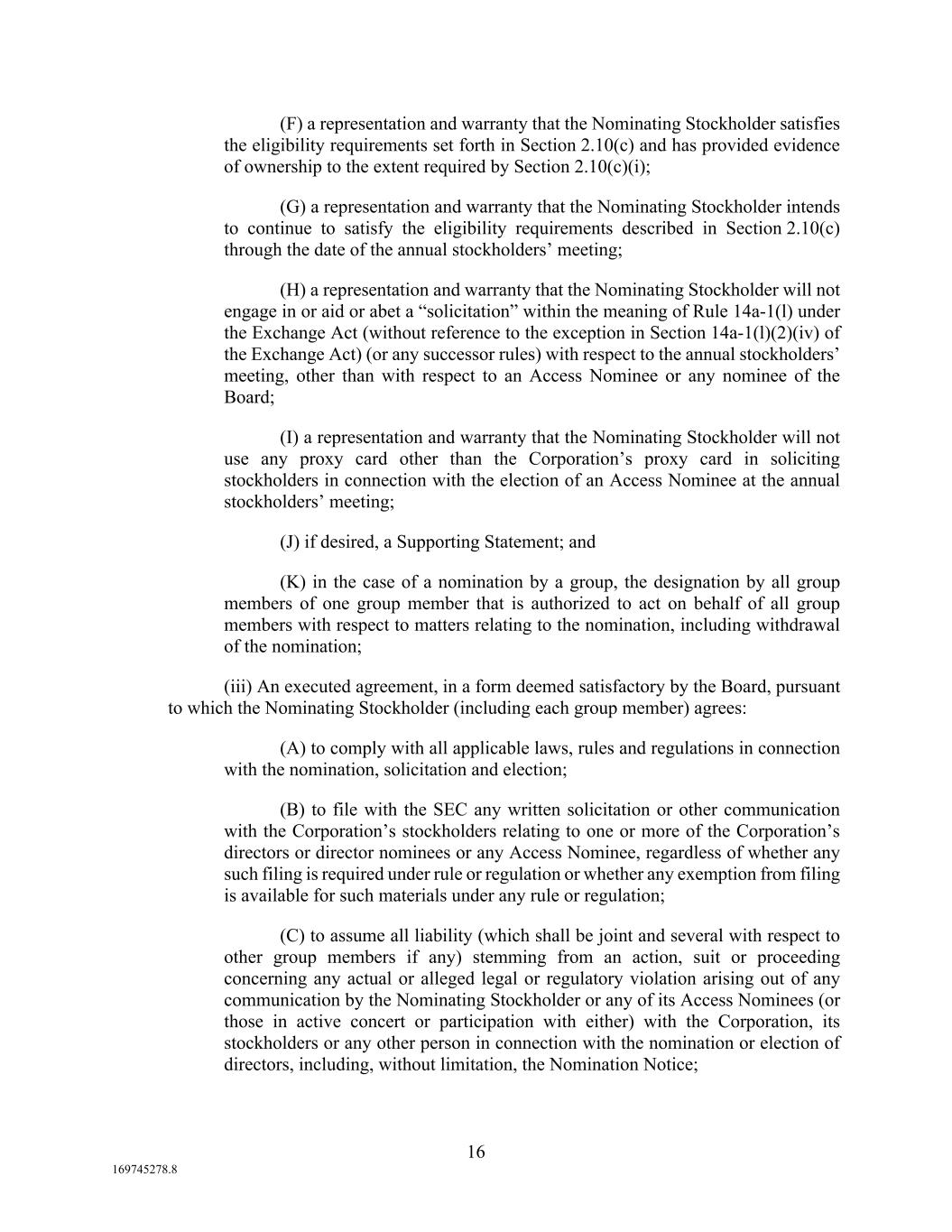 16 169745278.8 (F) a representation and warranty that the Nominating Stockholder satisfies the eligibility requirements set forth in Section 2.10(c) and has provided evidence of ownership to the extent required by Section 2.10(c)(i); (G) a representation and warranty that the Nominating Stockholder intends to continue to satisfy the eligibility requirements described in Section 2.10(c) through the date of the annual stockholders’ meeting; (H) a representation and warranty that the Nominating Stockholder will not engage in or aid or abet a “solicitation” within the meaning of Rule 14a-1(l) under the Exchange Act (without reference to the exception in Section 14a-1(l)(2)(iv) of the Exchange Act) (or any successor rules) with respect to the annual stockholders’ meeting, other than with respect to an Access Nominee or any nominee of the Board; (I) a representation and warranty that the Nominating Stockholder will not use any proxy card other than the Corporation’s proxy card in soliciting stockholders in connection with the election of an Access Nominee at the annual stockholders’ meeting; (J) if desired, a Supporting Statement; and (K) in the case of a nomination by a group, the designation by all group members of one group member that is authorized to act on behalf of all group members with respect to matters relating to the nomination, including withdrawal of the nomination; (iii) An executed agreement, in a form deemed satisfactory by the Board, pursuant to which the Nominating Stockholder (including each group member) agrees: (A) to comply with all applicable laws, rules and regulations in connection with the nomination, solicitation and election; (B) to file with the SEC any written solicitation or other communication with the Corporation’s stockholders relating to one or more of the Corporation’s directors or director nominees or any Access Nominee, regardless of whether any such filing is required under rule or regulation or whether any exemption from filing is available for such materials under any rule or regulation; (C) to assume all liability (which shall be joint and several with respect to other group members if any) stemming from an action, suit or proceeding concerning any actual or alleged legal or regulatory violation arising out of any communication by the Nominating Stockholder or any of its Access Nominees (or those in active concert or participation with either) with the Corporation, its stockholders or any other person in connection with the nomination or election of directors, including, without limitation, the Nomination Notice;