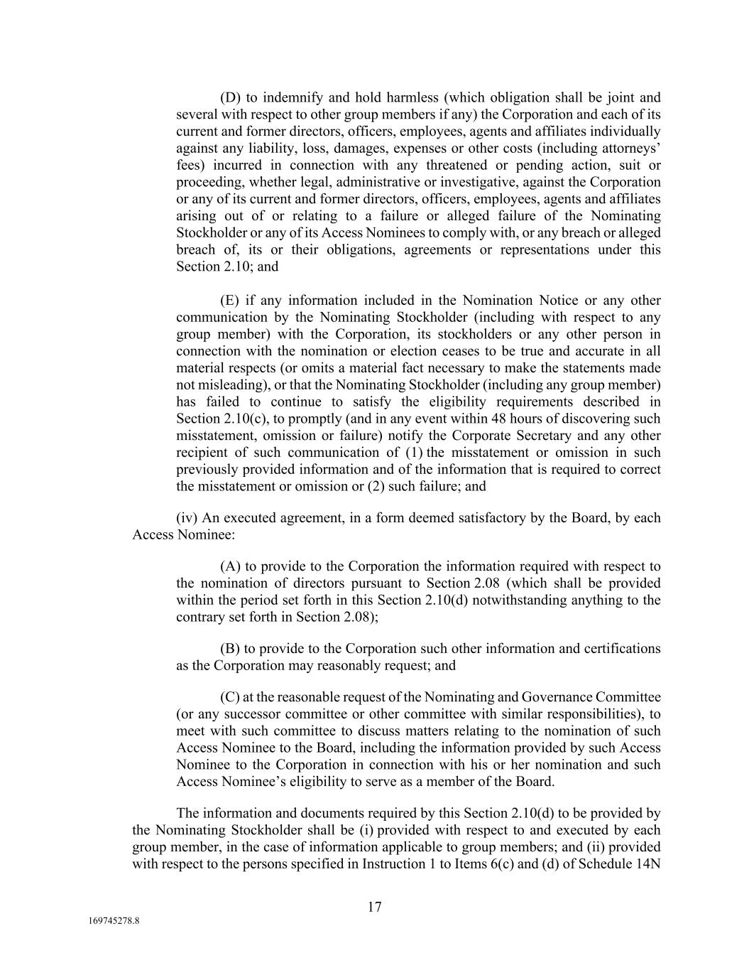 17 169745278.8 (D) to indemnify and hold harmless (which obligation shall be joint and several with respect to other group members if any) the Corporation and each of its current and former directors, officers, employees, agents and affiliates individually against any liability, loss, damages, expenses or other costs (including attorneys’ fees) incurred in connection with any threatened or pending action, suit or proceeding, whether legal, administrative or investigative, against the Corporation or any of its current and former directors, officers, employees, agents and affiliates arising out of or relating to a failure or alleged failure of the Nominating Stockholder or any of its Access Nominees to comply with, or any breach or alleged breach of, its or their obligations, agreements or representations under this Section 2.10; and (E) if any information included in the Nomination Notice or any other communication by the Nominating Stockholder (including with respect to any group member) with the Corporation, its stockholders or any other person in connection with the nomination or election ceases to be true and accurate in all material respects (or omits a material fact necessary to make the statements made not misleading), or that the Nominating Stockholder (including any group member) has failed to continue to satisfy the eligibility requirements described in Section 2.10(c), to promptly (and in any event within 48 hours of discovering such misstatement, omission or failure) notify the Corporate Secretary and any other recipient of such communication of (1) the misstatement or omission in such previously provided information and of the information that is required to correct the misstatement or omission or (2) such failure; and (iv) An executed agreement, in a form deemed satisfactory by the Board, by each Access Nominee: (A) to provide to the Corporation the information required with respect to the nomination of directors pursuant to Section 2.08 (which shall be provided within the period set forth in this Section 2.10(d) notwithstanding anything to the contrary set forth in Section 2.08); (B) to provide to the Corporation such other information and certifications as the Corporation may reasonably request; and (C) at the reasonable request of the Nominating and Governance Committee (or any successor committee or other committee with similar responsibilities), to meet with such committee to discuss matters relating to the nomination of such Access Nominee to the Board, including the information provided by such Access Nominee to the Corporation in connection with his or her nomination and such Access Nominee’s eligibility to serve as a member of the Board. The information and documents required by this Section 2.10(d) to be provided by the Nominating Stockholder shall be (i) provided with respect to and executed by each group member, in the case of information applicable to group members; and (ii) provided with respect to the persons specified in Instruction 1 to Items 6(c) and (d) of Schedule 14N