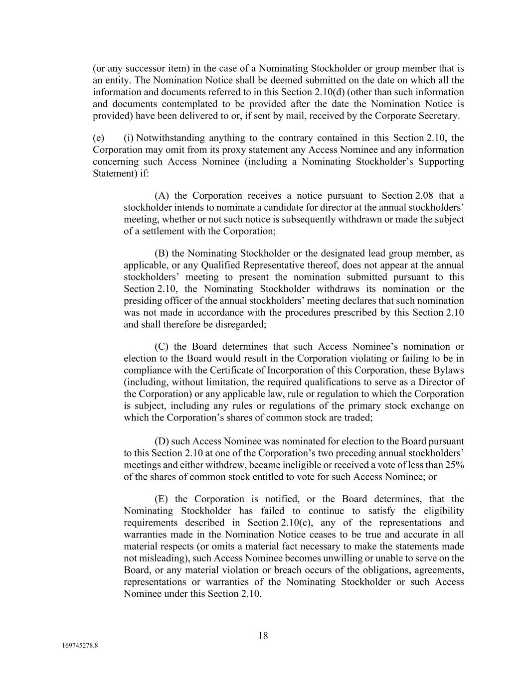 18 169745278.8 (or any successor item) in the case of a Nominating Stockholder or group member that is an entity. The Nomination Notice shall be deemed submitted on the date on which all the information and documents referred to in this Section 2.10(d) (other than such information and documents contemplated to be provided after the date the Nomination Notice is provided) have been delivered to or, if sent by mail, received by the Corporate Secretary. (e) (i) Notwithstanding anything to the contrary contained in this Section 2.10, the Corporation may omit from its proxy statement any Access Nominee and any information concerning such Access Nominee (including a Nominating Stockholder’s Supporting Statement) if: (A) the Corporation receives a notice pursuant to Section 2.08 that a stockholder intends to nominate a candidate for director at the annual stockholders’ meeting, whether or not such notice is subsequently withdrawn or made the subject of a settlement with the Corporation; (B) the Nominating Stockholder or the designated lead group member, as applicable, or any Qualified Representative thereof, does not appear at the annual stockholders’ meeting to present the nomination submitted pursuant to this Section 2.10, the Nominating Stockholder withdraws its nomination or the presiding officer of the annual stockholders’ meeting declares that such nomination was not made in accordance with the procedures prescribed by this Section 2.10 and shall therefore be disregarded; (C) the Board determines that such Access Nominee’s nomination or election to the Board would result in the Corporation violating or failing to be in compliance with the Certificate of Incorporation of this Corporation, these Bylaws (including, without limitation, the required qualifications to serve as a Director of the Corporation) or any applicable law, rule or regulation to which the Corporation is subject, including any rules or regulations of the primary stock exchange on which the Corporation’s shares of common stock are traded; (D) such Access Nominee was nominated for election to the Board pursuant to this Section 2.10 at one of the Corporation’s two preceding annual stockholders’ meetings and either withdrew, became ineligible or received a vote of less than 25% of the shares of common stock entitled to vote for such Access Nominee; or (E) the Corporation is notified, or the Board determines, that the Nominating Stockholder has failed to continue to satisfy the eligibility requirements described in Section 2.10(c), any of the representations and warranties made in the Nomination Notice ceases to be true and accurate in all material respects (or omits a material fact necessary to make the statements made not misleading), such Access Nominee becomes unwilling or unable to serve on the Board, or any material violation or breach occurs of the obligations, agreements, representations or warranties of the Nominating Stockholder or such Access Nominee under this Section 2.10.