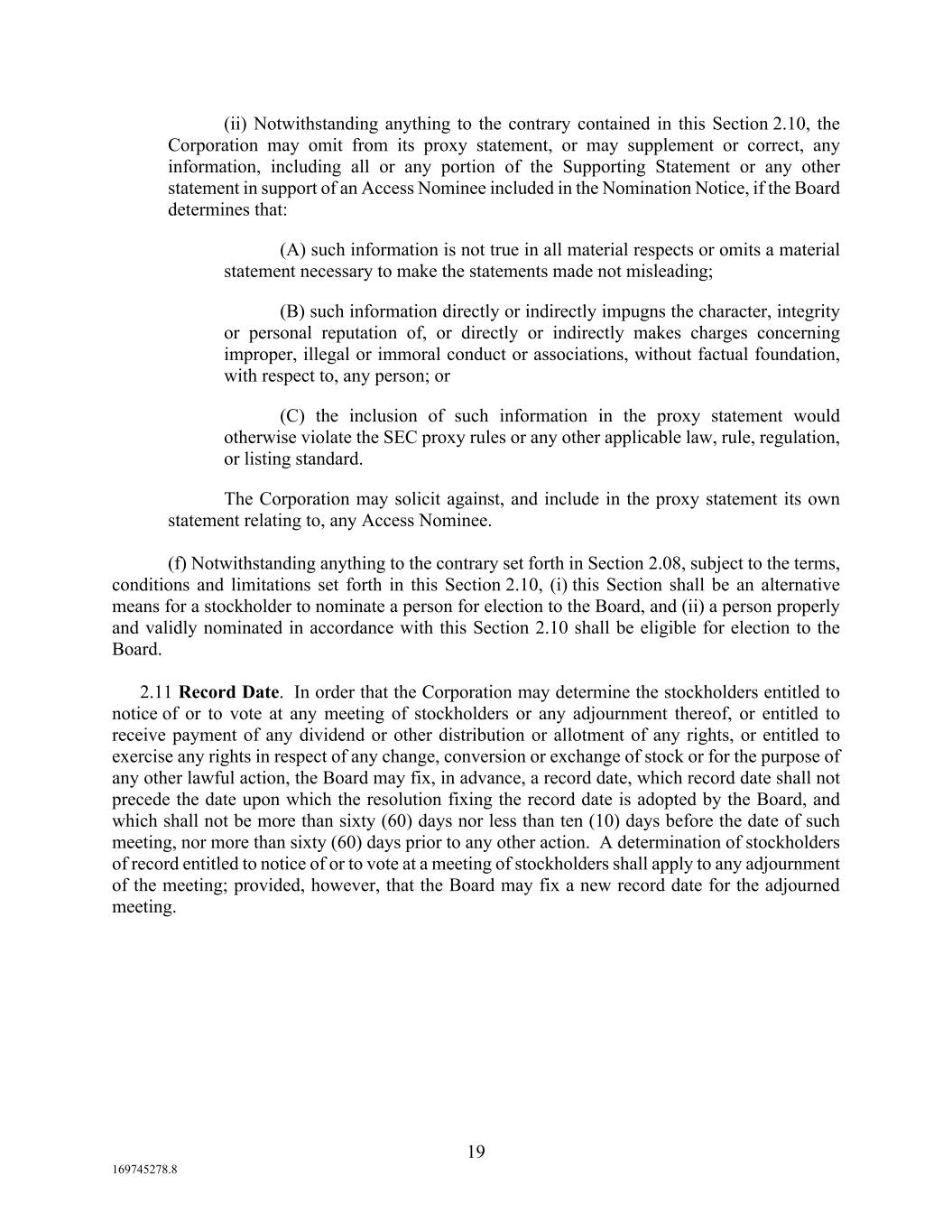 19 169745278.8 (ii) Notwithstanding anything to the contrary contained in this Section 2.10, the Corporation may omit from its proxy statement, or may supplement or correct, any information, including all or any portion of the Supporting Statement or any other statement in support of an Access Nominee included in the Nomination Notice, if the Board determines that: (A) such information is not true in all material respects or omits a material statement necessary to make the statements made not misleading; (B) such information directly or indirectly impugns the character, integrity or personal reputation of, or directly or indirectly makes charges concerning improper, illegal or immoral conduct or associations, without factual foundation, with respect to, any person; or (C) the inclusion of such information in the proxy statement would otherwise violate the SEC proxy rules or any other applicable law, rule, regulation, or listing standard. The Corporation may solicit against, and include in the proxy statement its own statement relating to, any Access Nominee. (f) Notwithstanding anything to the contrary set forth in Section 2.08, subject to the terms, conditions and limitations set forth in this Section 2.10, (i) this Section shall be an alternative means for a stockholder to nominate a person for election to the Board, and (ii) a person properly and validly nominated in accordance with this Section 2.10 shall be eligible for election to the Board. 2.11 Record Date. In order that the Corporation may determine the stockholders entitled to notice of or to vote at any meeting of stockholders or any adjournment thereof, or entitled to receive payment of any dividend or other distribution or allotment of any rights, or entitled to exercise any rights in respect of any change, conversion or exchange of stock or for the purpose of any other lawful action, the Board may fix, in advance, a record date, which record date shall not precede the date upon which the resolution fixing the record date is adopted by the Board, and which shall not be more than sixty (60) days nor less than ten (10) days before the date of such meeting, nor more than sixty (60) days prior to any other action. A determination of stockholders of record entitled to notice of or to vote at a meeting of stockholders shall apply to any adjournment of the meeting; provided, however, that the Board may fix a new record date for the adjourned meeting.