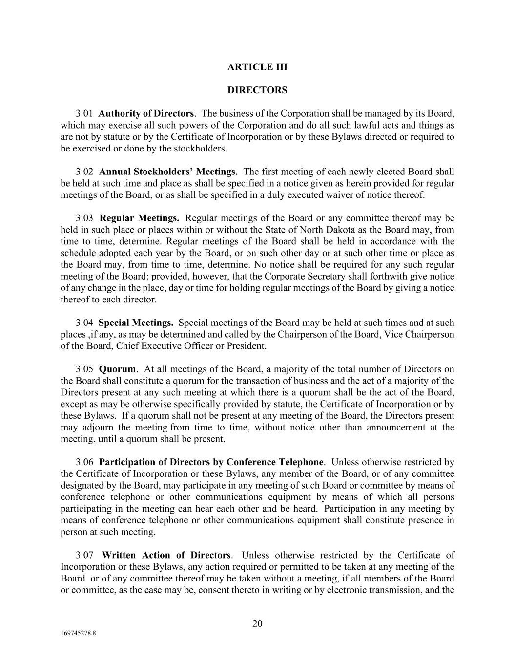 20 169745278.8 ARTICLE III DIRECTORS 3.01 Authority of Directors. The business of the Corporation shall be managed by its Board, which may exercise all such powers of the Corporation and do all such lawful acts and things as are not by statute or by the Certificate of Incorporation or by these Bylaws directed or required to be exercised or done by the stockholders. 3.02 Annual Stockholders’ Meetings. The first meeting of each newly elected Board shall be held at such time and place as shall be specified in a notice given as herein provided for regular meetings of the Board, or as shall be specified in a duly executed waiver of notice thereof. 3.03 Regular Meetings. Regular meetings of the Board or any committee thereof may be held in such place or places within or without the State of North Dakota as the Board may, from time to time, determine. Regular meetings of the Board shall be held in accordance with the schedule adopted each year by the Board, or on such other day or at such other time or place as the Board may, from time to time, determine. No notice shall be required for any such regular meeting of the Board; provided, however, that the Corporate Secretary shall forthwith give notice of any change in the place, day or time for holding regular meetings of the Board by giving a notice thereof to each director. 3.04 Special Meetings. Special meetings of the Board may be held at such times and at such places ,if any, as may be determined and called by the Chairperson of the Board, Vice Chairperson of the Board, Chief Executive Officer or President. 3.05 Quorum. At all meetings of the Board, a majority of the total number of Directors on the Board shall constitute a quorum for the transaction of business and the act of a majority of the Directors present at any such meeting at which there is a quorum shall be the act of the Board, except as may be otherwise specifically provided by statute, the Certificate of Incorporation or by these Bylaws. If a quorum shall not be present at any meeting of the Board, the Directors present may adjourn the meeting from time to time, without notice other than announcement at the meeting, until a quorum shall be present. 3.06 Participation of Directors by Conference Telephone. Unless otherwise restricted by the Certificate of Incorporation or these Bylaws, any member of the Board, or of any committee designated by the Board, may participate in any meeting of such Board or committee by means of conference telephone or other communications equipment by means of which all persons participating in the meeting can hear each other and be heard. Participation in any meeting by means of conference telephone or other communications equipment shall constitute presence in person at such meeting. 3.07 Written Action of Directors. Unless otherwise restricted by the Certificate of Incorporation or these Bylaws, any action required or permitted to be taken at any meeting of the Board or of any committee thereof may be taken without a meeting, if all members of the Board or committee, as the case may be, consent thereto in writing or by electronic transmission, and the