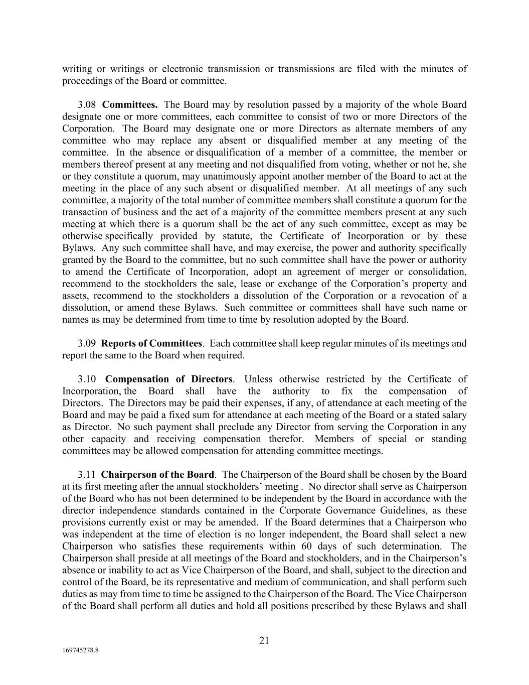 21 169745278.8 writing or writings or electronic transmission or transmissions are filed with the minutes of proceedings of the Board or committee. 3.08 Committees. The Board may by resolution passed by a majority of the whole Board designate one or more committees, each committee to consist of two or more Directors of the Corporation. The Board may designate one or more Directors as alternate members of any committee who may replace any absent or disqualified member at any meeting of the committee. In the absence or disqualification of a member of a committee, the member or members thereof present at any meeting and not disqualified from voting, whether or not he, she or they constitute a quorum, may unanimously appoint another member of the Board to act at the meeting in the place of any such absent or disqualified member. At all meetings of any such committee, a majority of the total number of committee members shall constitute a quorum for the transaction of business and the act of a majority of the committee members present at any such meeting at which there is a quorum shall be the act of any such committee, except as may be otherwise specifically provided by statute, the Certificate of Incorporation or by these Bylaws. Any such committee shall have, and may exercise, the power and authority specifically granted by the Board to the committee, but no such committee shall have the power or authority to amend the Certificate of Incorporation, adopt an agreement of merger or consolidation, recommend to the stockholders the sale, lease or exchange of the Corporation’s property and assets, recommend to the stockholders a dissolution of the Corporation or a revocation of a dissolution, or amend these Bylaws. Such committee or committees shall have such name or names as may be determined from time to time by resolution adopted by the Board. 3.09 Reports of Committees. Each committee shall keep regular minutes of its meetings and report the same to the Board when required. 3.10 Compensation of Directors. Unless otherwise restricted by the Certificate of Incorporation, the Board shall have the authority to fix the compensation of Directors. The Directors may be paid their expenses, if any, of attendance at each meeting of the Board and may be paid a fixed sum for attendance at each meeting of the Board or a stated salary as Director. No such payment shall preclude any Director from serving the Corporation in any other capacity and receiving compensation therefor. Members of special or standing committees may be allowed compensation for attending committee meetings. 3.11 Chairperson of the Board. The Chairperson of the Board shall be chosen by the Board at its first meeting after the annual stockholders’ meeting . No director shall serve as Chairperson of the Board who has not been determined to be independent by the Board in accordance with the director independence standards contained in the Corporate Governance Guidelines, as these provisions currently exist or may be amended. If the Board determines that a Chairperson who was independent at the time of election is no longer independent, the Board shall select a new Chairperson who satisfies these requirements within 60 days of such determination. The Chairperson shall preside at all meetings of the Board and stockholders, and in the Chairperson’s absence or inability to act as Vice Chairperson of the Board, and shall, subject to the direction and control of the Board, be its representative and medium of communication, and shall perform such duties as may from time to time be assigned to the Chairperson of the Board. The Vice Chairperson of the Board shall perform all duties and hold all positions prescribed by these Bylaws and shall