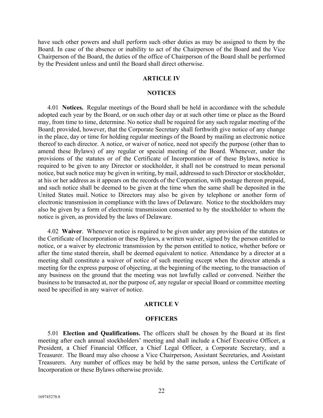22 169745278.8 have such other powers and shall perform such other duties as may be assigned to them by the Board. In case of the absence or inability to act of the Chairperson of the Board and the Vice Chairperson of the Board, the duties of the office of Chairperson of the Board shall be performed by the President unless and until the Board shall direct otherwise. ARTICLE IV NOTICES 4.01 Notices. Regular meetings of the Board shall be held in accordance with the schedule adopted each year by the Board, or on such other day or at such other time or place as the Board may, from time to time, determine. No notice shall be required for any such regular meeting of the Board; provided, however, that the Corporate Secretary shall forthwith give notice of any change in the place, day or time for holding regular meetings of the Board by mailing an electronic notice thereof to each director. A notice, or waiver of notice, need not specify the purpose (other than to amend these Bylaws) of any regular or special meeting of the Board. Whenever, under the provisions of the statutes or of the Certificate of Incorporation or of these Bylaws, notice is required to be given to any Director or stockholder, it shall not be construed to mean personal notice, but such notice may be given in writing, by mail, addressed to such Director or stockholder, at his or her address as it appears on the records of the Corporation, with postage thereon prepaid, and such notice shall be deemed to be given at the time when the same shall be deposited in the United States mail. Notice to Directors may also be given by telephone or another form of electronic transmission in compliance with the laws of Delaware. Notice to the stockholders may also be given by a form of electronic transmission consented to by the stockholder to whom the notice is given, as provided by the laws of Delaware. 4.02 Waiver. Whenever notice is required to be given under any provision of the statutes or the Certificate of Incorporation or these Bylaws, a written waiver, signed by the person entitled to notice, or a waiver by electronic transmission by the person entitled to notice, whether before or after the time stated therein, shall be deemed equivalent to notice. Attendance by a director at a meeting shall constitute a waiver of notice of such meeting except when the director attends a meeting for the express purpose of objecting, at the beginning of the meeting, to the transaction of any business on the ground that the meeting was not lawfully called or convened. Neither the business to be transacted at, nor the purpose of, any regular or special Board or committee meeting need be specified in any waiver of notice. ARTICLE V OFFICERS 5.01 Election and Qualifications. The officers shall be chosen by the Board at its first meeting after each annual stockholders’ meeting and shall include a Chief Executive Officer, a President, a Chief Financial Officer, a Chief Legal Officer, a Corporate Secretary, and a Treasurer. The Board may also choose a Vice Chairperson, Assistant Secretaries, and Assistant Treasurers. Any number of offices may be held by the same person, unless the Certificate of Incorporation or these Bylaws otherwise provide.