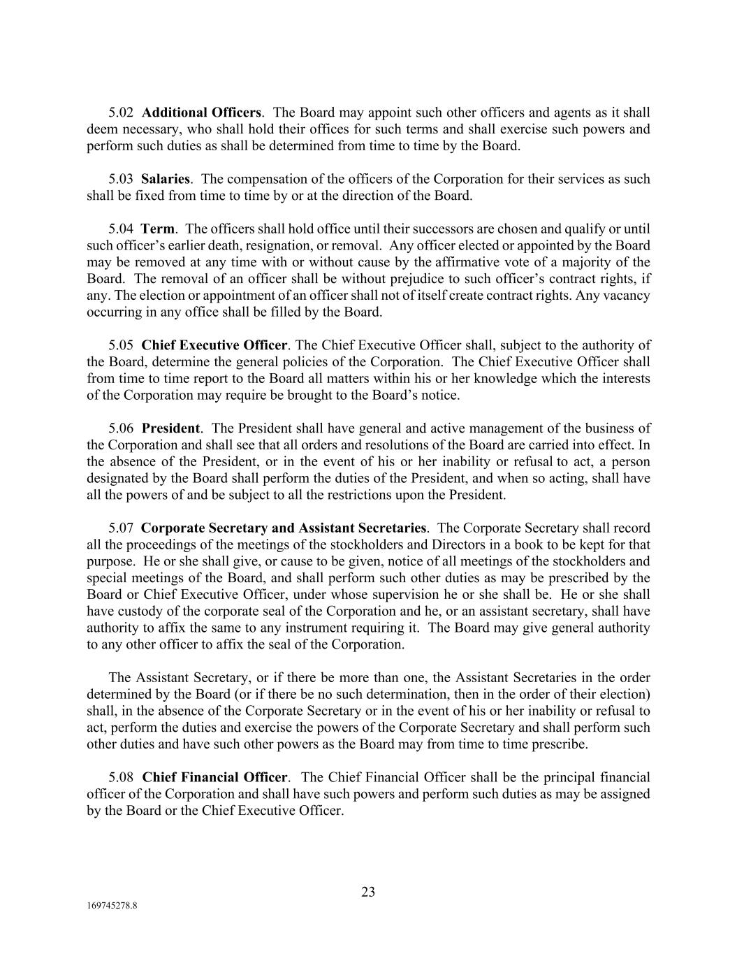 23 169745278.8 5.02 Additional Officers. The Board may appoint such other officers and agents as it shall deem necessary, who shall hold their offices for such terms and shall exercise such powers and perform such duties as shall be determined from time to time by the Board. 5.03 Salaries. The compensation of the officers of the Corporation for their services as such shall be fixed from time to time by or at the direction of the Board. 5.04 Term. The officers shall hold office until their successors are chosen and qualify or until such officer’s earlier death, resignation, or removal. Any officer elected or appointed by the Board may be removed at any time with or without cause by the affirmative vote of a majority of the Board. The removal of an officer shall be without prejudice to such officer’s contract rights, if any. The election or appointment of an officer shall not of itself create contract rights. Any vacancy occurring in any office shall be filled by the Board. 5.05 Chief Executive Officer. The Chief Executive Officer shall, subject to the authority of the Board, determine the general policies of the Corporation. The Chief Executive Officer shall from time to time report to the Board all matters within his or her knowledge which the interests of the Corporation may require be brought to the Board’s notice. 5.06 President. The President shall have general and active management of the business of the Corporation and shall see that all orders and resolutions of the Board are carried into effect. In the absence of the President, or in the event of his or her inability or refusal to act, a person designated by the Board shall perform the duties of the President, and when so acting, shall have all the powers of and be subject to all the restrictions upon the President. 5.07 Corporate Secretary and Assistant Secretaries. The Corporate Secretary shall record all the proceedings of the meetings of the stockholders and Directors in a book to be kept for that purpose. He or she shall give, or cause to be given, notice of all meetings of the stockholders and special meetings of the Board, and shall perform such other duties as may be prescribed by the Board or Chief Executive Officer, under whose supervision he or she shall be. He or she shall have custody of the corporate seal of the Corporation and he, or an assistant secretary, shall have authority to affix the same to any instrument requiring it. The Board may give general authority to any other officer to affix the seal of the Corporation. The Assistant Secretary, or if there be more than one, the Assistant Secretaries in the order determined by the Board (or if there be no such determination, then in the order of their election) shall, in the absence of the Corporate Secretary or in the event of his or her inability or refusal to act, perform the duties and exercise the powers of the Corporate Secretary and shall perform such other duties and have such other powers as the Board may from time to time prescribe. 5.08 Chief Financial Officer. The Chief Financial Officer shall be the principal financial officer of the Corporation and shall have such powers and perform such duties as may be assigned by the Board or the Chief Executive Officer.