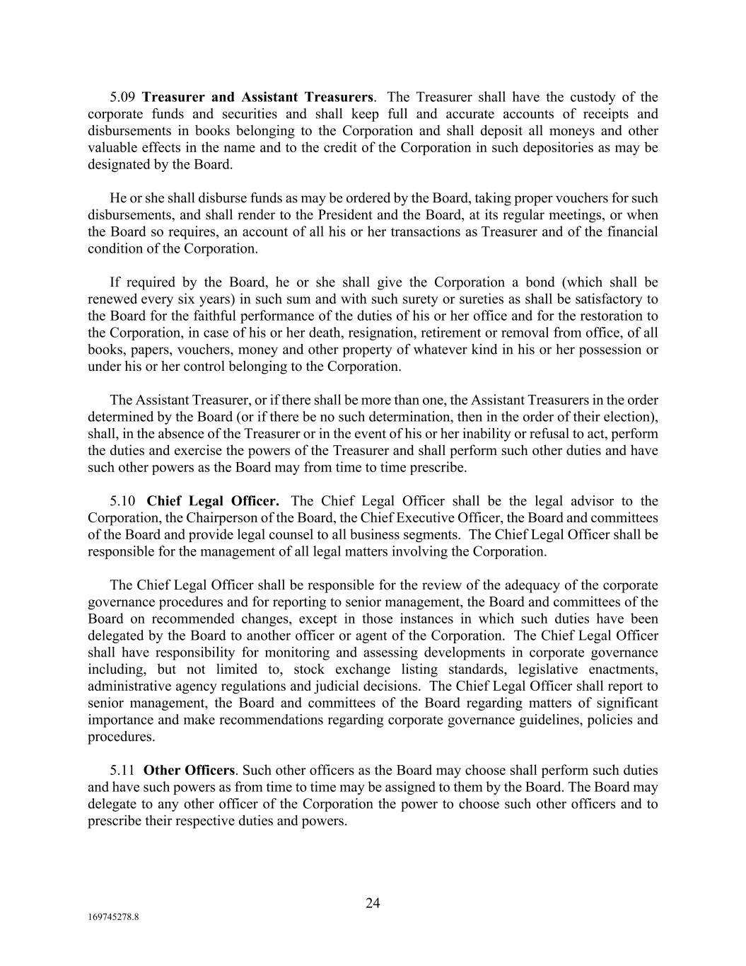 24 169745278.8 5.09 Treasurer and Assistant Treasurers. The Treasurer shall have the custody of the corporate funds and securities and shall keep full and accurate accounts of receipts and disbursements in books belonging to the Corporation and shall deposit all moneys and other valuable effects in the name and to the credit of the Corporation in such depositories as may be designated by the Board. He or she shall disburse funds as may be ordered by the Board, taking proper vouchers for such disbursements, and shall render to the President and the Board, at its regular meetings, or when the Board so requires, an account of all his or her transactions as Treasurer and of the financial condition of the Corporation. If required by the Board, he or she shall give the Corporation a bond (which shall be renewed every six years) in such sum and with such surety or sureties as shall be satisfactory to the Board for the faithful performance of the duties of his or her office and for the restoration to the Corporation, in case of his or her death, resignation, retirement or removal from office, of all books, papers, vouchers, money and other property of whatever kind in his or her possession or under his or her control belonging to the Corporation. The Assistant Treasurer, or if there shall be more than one, the Assistant Treasurers in the order determined by the Board (or if there be no such determination, then in the order of their election), shall, in the absence of the Treasurer or in the event of his or her inability or refusal to act, perform the duties and exercise the powers of the Treasurer and shall perform such other duties and have such other powers as the Board may from time to time prescribe. 5.10 Chief Legal Officer. The Chief Legal Officer shall be the legal advisor to the Corporation, the Chairperson of the Board, the Chief Executive Officer, the Board and committees of the Board and provide legal counsel to all business segments. The Chief Legal Officer shall be responsible for the management of all legal matters involving the Corporation. The Chief Legal Officer shall be responsible for the review of the adequacy of the corporate governance procedures and for reporting to senior management, the Board and committees of the Board on recommended changes, except in those instances in which such duties have been delegated by the Board to another officer or agent of the Corporation. The Chief Legal Officer shall have responsibility for monitoring and assessing developments in corporate governance including, but not limited to, stock exchange listing standards, legislative enactments, administrative agency regulations and judicial decisions. The Chief Legal Officer shall report to senior management, the Board and committees of the Board regarding matters of significant importance and make recommendations regarding corporate governance guidelines, policies and procedures. 5.11 Other Officers. Such other officers as the Board may choose shall perform such duties and have such powers as from time to time may be assigned to them by the Board. The Board may delegate to any other officer of the Corporation the power to choose such other officers and to prescribe their respective duties and powers.
