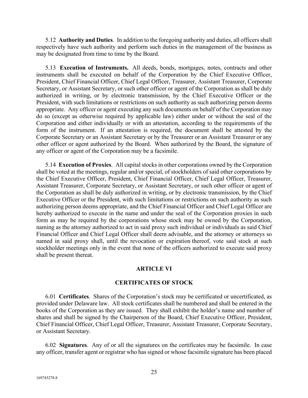25 169745278.8 5.12 Authority and Duties. In addition to the foregoing authority and duties, all officers shall respectively have such authority and perform such duties in the management of the business as may be designated from time to time by the Board. 5.13 Execution of Instruments. All deeds, bonds, mortgages, notes, contracts and other instruments shall be executed on behalf of the Corporation by the Chief Executive Officer, President, Chief Financial Officer, Chief Legal Officer, Treasurer, Assistant Treasurer, Corporate Secretary, or Assistant Secretary, or such other officer or agent of the Corporation as shall be duly authorized in writing, or by electronic transmission, by the Chief Executive Officer or the President, with such limitations or restrictions on such authority as such authorizing person deems appropriate. Any officer or agent executing any such documents on behalf of the Corporation may do so (except as otherwise required by applicable law) either under or without the seal of the Corporation and either individually or with an attestation, according to the requirements of the form of the instrument. If an attestation is required, the document shall be attested by the Corporate Secretary or an Assistant Secretary or by the Treasurer or an Assistant Treasurer or any other officer or agent authorized by the Board. When authorized by the Board, the signature of any officer or agent of the Corporation may be a facsimile. 5.14 Execution of Proxies. All capital stocks in other corporations owned by the Corporation shall be voted at the meetings, regular and/or special, of stockholders of said other corporations by the Chief Executive Officer, President, Chief Financial Officer, Chief Legal Officer, Treasurer, Assistant Treasurer, Corporate Secretary, or Assistant Secretary, or such other officer or agent of the Corporation as shall be duly authorized in writing, or by electronic transmission, by the Chief Executive Officer or the President, with such limitations or restrictions on such authority as such authorizing person deems appropriate, and the Chief Financial Officer and Chief Legal Officer are hereby authorized to execute in the name and under the seal of the Corporation proxies in such form as may be required by the corporations whose stock may be owned by the Corporation, naming as the attorney authorized to act in said proxy such individual or individuals as said Chief Financial Officer and Chief Legal Officer shall deem advisable, and the attorney or attorneys so named in said proxy shall, until the revocation or expiration thereof, vote said stock at such stockholder meetings only in the event that none of the officers authorized to execute said proxy shall be present thereat. ARTICLE VI CERTIFICATES OF STOCK 6.01 Certificates. Shares of the Corporation’s stock may be certificated or uncertificated, as provided under Delaware law. All stock certificates shall be numbered and shall be entered in the books of the Corporation as they are issued. They shall exhibit the holder’s name and number of shares and shall be signed by the Chairperson of the Board, Chief Executive Officer, President, Chief Financial Officer, Chief Legal Officer, Treasurer, Assistant Treasurer, Corporate Secretary, or Assistant Secretary. 6.02 Signatures. Any of or all the signatures on the certificates may be facsimile. In case any officer, transfer agent or registrar who has signed or whose facsimile signature has been placed