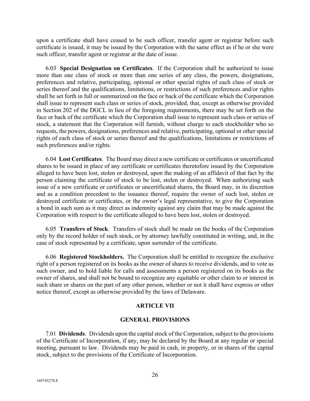 26 169745278.8 upon a certificate shall have ceased to be such officer, transfer agent or registrar before such certificate is issued, it may be issued by the Corporation with the same effect as if he or she were such officer, transfer agent or registrar at the date of issue. 6.03 Special Designation on Certificates. If the Corporation shall be authorized to issue more than one class of stock or more than one series of any class, the powers, designations, preferences and relative, participating, optional or other special rights of each class of stock or series thereof and the qualifications, limitations, or restrictions of such preferences and/or rights shall be set forth in full or summarized on the face or back of the certificate which the Corporation shall issue to represent such class or series of stock, provided, that, except as otherwise provided in Section 202 of the DGCL in lieu of the foregoing requirements, there may be set forth on the face or back of the certificate which the Corporation shall issue to represent such class or series of stock, a statement that the Corporation will furnish, without charge to each stockholder who so requests, the powers, designations, preferences and relative, participating, optional or other special rights of each class of stock or series thereof and the qualifications, limitations or restrictions of such preferences and/or rights. 6.04 Lost Certificates. The Board may direct a new certificate or certificates or uncertificated shares to be issued in place of any certificate or certificates theretofore issued by the Corporation alleged to have been lost, stolen or destroyed, upon the making of an affidavit of that fact by the person claiming the certificate of stock to be lost, stolen or destroyed. When authorizing such issue of a new certificate or certificates or uncertificated shares, the Board may, in its discretion and as a condition precedent to the issuance thereof, require the owner of such lost, stolen or destroyed certificate or certificates, or the owner’s legal representative, to give the Corporation a bond in such sum as it may direct as indemnity against any claim that may be made against the Corporation with respect to the certificate alleged to have been lost, stolen or destroyed. 6.05 Transfers of Stock. Transfers of stock shall be made on the books of the Corporation only by the record holder of such stock, or by attorney lawfully constituted in writing, and, in the case of stock represented by a certificate, upon surrender of the certificate. 6.06 Registered Stockholders. The Corporation shall be entitled to recognize the exclusive right of a person registered on its books as the owner of shares to receive dividends, and to vote as such owner, and to hold liable for calls and assessments a person registered on its books as the owner of shares, and shall not be bound to recognize any equitable or other claim to or interest in such share or shares on the part of any other person, whether or not it shall have express or other notice thereof, except as otherwise provided by the laws of Delaware. ARTICLE VII GENERAL PROVISIONS 7.01 Dividends. Dividends upon the capital stock of the Corporation, subject to the provisions of the Certificate of Incorporation, if any, may be declared by the Board at any regular or special meeting, pursuant to law. Dividends may be paid in cash, in property, or in shares of the capital stock, subject to the provisions of the Certificate of Incorporation.