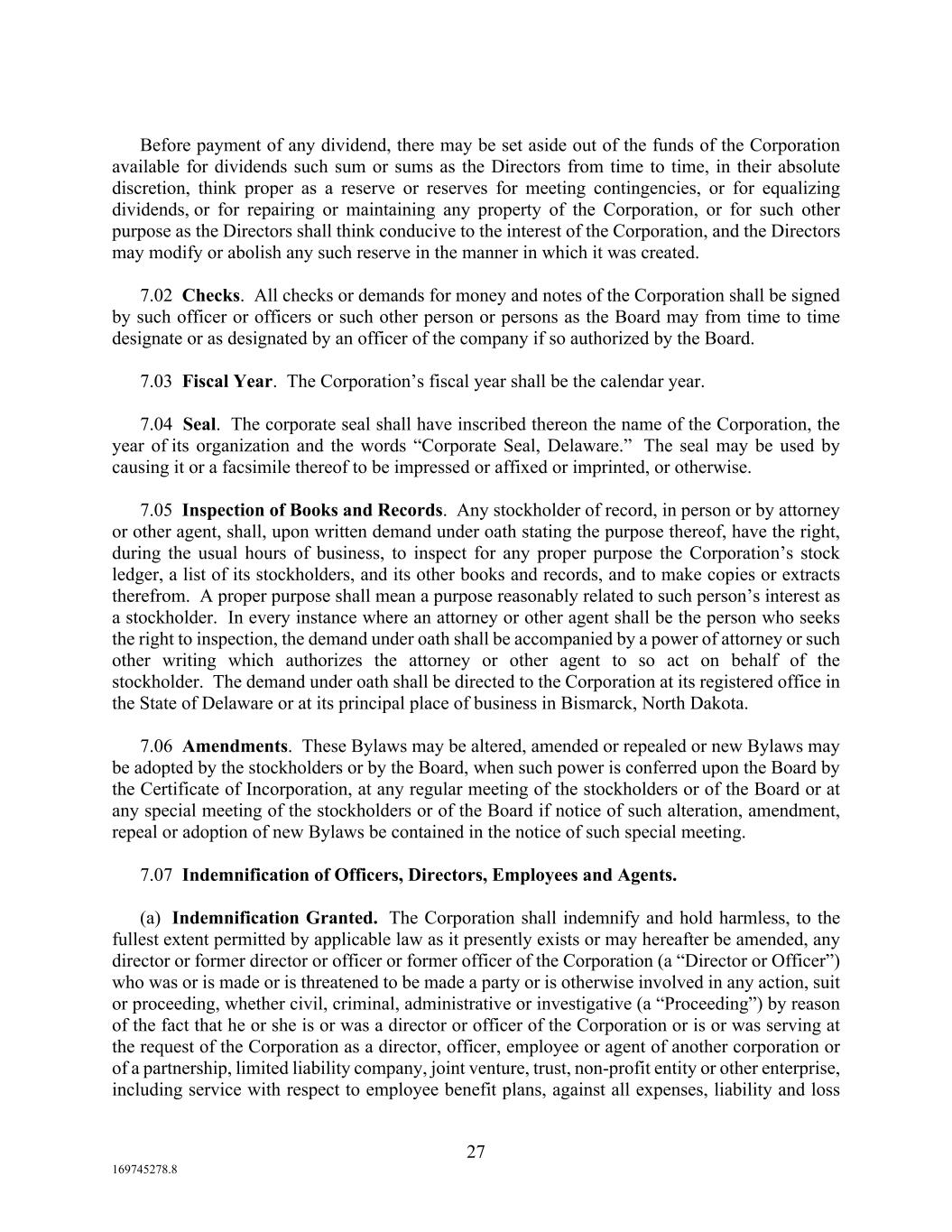 27 169745278.8 Before payment of any dividend, there may be set aside out of the funds of the Corporation available for dividends such sum or sums as the Directors from time to time, in their absolute discretion, think proper as a reserve or reserves for meeting contingencies, or for equalizing dividends, or for repairing or maintaining any property of the Corporation, or for such other purpose as the Directors shall think conducive to the interest of the Corporation, and the Directors may modify or abolish any such reserve in the manner in which it was created. 7.02 Checks. All checks or demands for money and notes of the Corporation shall be signed by such officer or officers or such other person or persons as the Board may from time to time designate or as designated by an officer of the company if so authorized by the Board. 7.03 Fiscal Year. The Corporation’s fiscal year shall be the calendar year. 7.04 Seal. The corporate seal shall have inscribed thereon the name of the Corporation, the year of its organization and the words “Corporate Seal, Delaware.” The seal may be used by causing it or a facsimile thereof to be impressed or affixed or imprinted, or otherwise. 7.05 Inspection of Books and Records. Any stockholder of record, in person or by attorney or other agent, shall, upon written demand under oath stating the purpose thereof, have the right, during the usual hours of business, to inspect for any proper purpose the Corporation’s stock ledger, a list of its stockholders, and its other books and records, and to make copies or extracts therefrom. A proper purpose shall mean a purpose reasonably related to such person’s interest as a stockholder. In every instance where an attorney or other agent shall be the person who seeks the right to inspection, the demand under oath shall be accompanied by a power of attorney or such other writing which authorizes the attorney or other agent to so act on behalf of the stockholder. The demand under oath shall be directed to the Corporation at its registered office in the State of Delaware or at its principal place of business in Bismarck, North Dakota. 7.06 Amendments. These Bylaws may be altered, amended or repealed or new Bylaws may be adopted by the stockholders or by the Board, when such power is conferred upon the Board by the Certificate of Incorporation, at any regular meeting of the stockholders or of the Board or at any special meeting of the stockholders or of the Board if notice of such alteration, amendment, repeal or adoption of new Bylaws be contained in the notice of such special meeting. 7.07 Indemnification of Officers, Directors, Employees and Agents. (a) Indemnification Granted. The Corporation shall indemnify and hold harmless, to the fullest extent permitted by applicable law as it presently exists or may hereafter be amended, any director or former director or officer or former officer of the Corporation (a “Director or Officer”) who was or is made or is threatened to be made a party or is otherwise involved in any action, suit or proceeding, whether civil, criminal, administrative or investigative (a “Proceeding”) by reason of the fact that he or she is or was a director or officer of the Corporation or is or was serving at the request of the Corporation as a director, officer, employee or agent of another corporation or of a partnership, limited liability company, joint venture, trust, non-profit entity or other enterprise, including service with respect to employee benefit plans, against all expenses, liability and loss