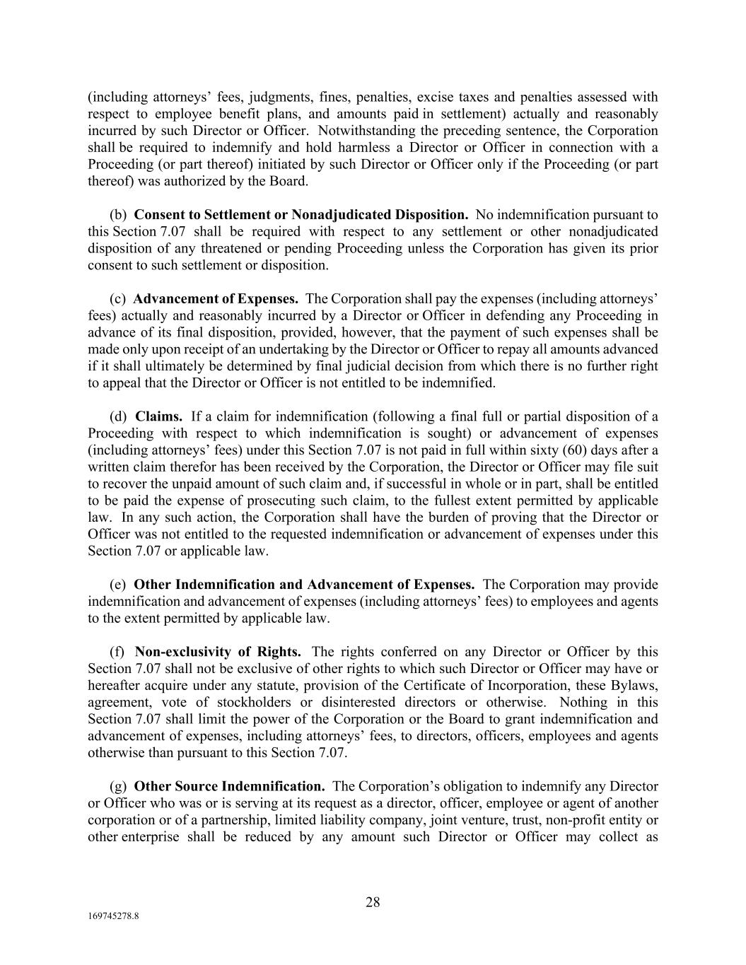 28 169745278.8 (including attorneys’ fees, judgments, fines, penalties, excise taxes and penalties assessed with respect to employee benefit plans, and amounts paid in settlement) actually and reasonably incurred by such Director or Officer. Notwithstanding the preceding sentence, the Corporation shall be required to indemnify and hold harmless a Director or Officer in connection with a Proceeding (or part thereof) initiated by such Director or Officer only if the Proceeding (or part thereof) was authorized by the Board. (b) Consent to Settlement or Nonadjudicated Disposition. No indemnification pursuant to this Section 7.07 shall be required with respect to any settlement or other nonadjudicated disposition of any threatened or pending Proceeding unless the Corporation has given its prior consent to such settlement or disposition. (c) Advancement of Expenses. The Corporation shall pay the expenses (including attorneys’ fees) actually and reasonably incurred by a Director or Officer in defending any Proceeding in advance of its final disposition, provided, however, that the payment of such expenses shall be made only upon receipt of an undertaking by the Director or Officer to repay all amounts advanced if it shall ultimately be determined by final judicial decision from which there is no further right to appeal that the Director or Officer is not entitled to be indemnified. (d) Claims. If a claim for indemnification (following a final full or partial disposition of a Proceeding with respect to which indemnification is sought) or advancement of expenses (including attorneys’ fees) under this Section 7.07 is not paid in full within sixty (60) days after a written claim therefor has been received by the Corporation, the Director or Officer may file suit to recover the unpaid amount of such claim and, if successful in whole or in part, shall be entitled to be paid the expense of prosecuting such claim, to the fullest extent permitted by applicable law. In any such action, the Corporation shall have the burden of proving that the Director or Officer was not entitled to the requested indemnification or advancement of expenses under this Section 7.07 or applicable law. (e) Other Indemnification and Advancement of Expenses. The Corporation may provide indemnification and advancement of expenses (including attorneys’ fees) to employees and agents to the extent permitted by applicable law. (f) Non-exclusivity of Rights. The rights conferred on any Director or Officer by this Section 7.07 shall not be exclusive of other rights to which such Director or Officer may have or hereafter acquire under any statute, provision of the Certificate of Incorporation, these Bylaws, agreement, vote of stockholders or disinterested directors or otherwise. Nothing in this Section 7.07 shall limit the power of the Corporation or the Board to grant indemnification and advancement of expenses, including attorneys’ fees, to directors, officers, employees and agents otherwise than pursuant to this Section 7.07. (g) Other Source Indemnification. The Corporation’s obligation to indemnify any Director or Officer who was or is serving at its request as a director, officer, employee or agent of another corporation or of a partnership, limited liability company, joint venture, trust, non-profit entity or other enterprise shall be reduced by any amount such Director or Officer may collect as
