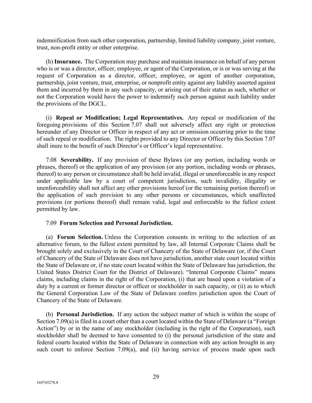 29 169745278.8 indemnification from such other corporation, partnership, limited liability company, joint venture, trust, non-profit entity or other enterprise. (h) Insurance. The Corporation may purchase and maintain insurance on behalf of any person who is or was a director, officer, employee, or agent of the Corporation, or is or was serving at the request of Corporation as a director, officer, employee, or agent of another corporation, partnership, joint venture, trust, enterprise, or nonprofit entity against any liability asserted against them and incurred by them in any such capacity, or arising out of their status as such, whether or not the Corporation would have the power to indemnify such person against such liability under the provisions of the DGCL. (i) Repeal or Modification; Legal Representatives. Any repeal or modification of the foregoing provisions of this Section 7.07 shall not adversely affect any right or protection hereunder of any Director or Officer in respect of any act or omission occurring prior to the time of such repeal or modification. The rights provided to any Director or Officer by this Section 7.07 shall inure to the benefit of such Director’s or Officer’s legal representative. 7.08 Severability. If any provision of these Bylaws (or any portion, including words or phrases, thereof) or the application of any provision (or any portion, including words or phrases, thereof) to any person or circumstance shall be held invalid, illegal or unenforceable in any respect under applicable law by a court of competent jurisdiction, such invalidity, illegality or unenforceability shall not affect any other provisions hereof (or the remaining portion thereof) or the application of such provision to any other persons or circumstances, which unaffected provisions (or portions thereof) shall remain valid, legal and enforceable to the fullest extent permitted by law. 7.09 Forum Selection and Personal Jurisdiction. (a) Forum Selection. Unless the Corporation consents in writing to the selection of an alternative forum, to the fullest extent permitted by law, all Internal Corporate Claims shall be brought solely and exclusively in the Court of Chancery of the State of Delaware (or, if the Court of Chancery of the State of Delaware does not have jurisdiction, another state court located within the State of Delaware or, if no state court located within the State of Delaware has jurisdiction, the United States District Court for the District of Delaware). “Internal Corporate Claims” means claims, including claims in the right of the Corporation, (i) that are based upon a violation of a duty by a current or former director or officer or stockholder in such capacity, or (ii) as to which the General Corporation Law of the State of Delaware confers jurisdiction upon the Court of Chancery of the State of Delaware. (b) Personal Jurisdiction. If any action the subject matter of which is within the scope of Section 7.09(a) is filed in a court other than a court located within the State of Delaware (a “Foreign Action”) by or in the name of any stockholder (including in the right of the Corporation), such stockholder shall be deemed to have consented to (i) the personal jurisdiction of the state and federal courts located within the State of Delaware in connection with any action brought in any such court to enforce Section 7.09(a), and (ii) having service of process made upon such