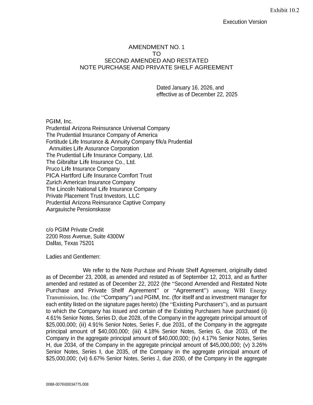 Execution Version 0088-0076\00034775.008 AMENDMENT NO. 1 TO SECOND AMENDED AND RESTATED NOTE PURCHASE AND PRIVATE SHELF AGREEMENT Dated January 16, 2026, and effective as of December 22, 2025 PGIM, Inc. Prudential Arizona Reinsurance Universal Company The Prudential Insurance Company of America Fortitude Life Insurance & Annuity Company f/k/a Prudential Annuities Life Assurance Corporation The Prudential Life Insurance Company, Ltd. The Gibraltar Life Insurance Co., Ltd. Pruco Life Insurance Company PICA Hartford Life Insurance Comfort Trust Zurich American Insurance Company The Lincoln National Life Insurance Company Private Placement Trust Investors, LLC Prudential Arizona Reinsurance Captive Company Aargauische Pensionskasse c/o PGIM Private Credit 2200 Ross Avenue, Suite 4300W Dallas, Texas 75201 Ladies and Gentlemen: We refer to the Note Purchase and Private Shelf Agreement, originally dated as of December 23, 2008, as amended and restated as of September 12, 2013, and as further amended and restated as of December 22, 2022 (the “Second Amended and Restated Note Purchase and Private Shelf Agreement” or “Agreement”) among WBI Energy Transmission, Inc. (the “Company”) and PGIM, Inc. (for itself and as investment manager for each entity listed on the signature pages hereto) (the “Existing Purchasers”), and as pursuant to which the Company has issued and certain of the Existing Purchasers have purchased (i) 4.61% Senior Notes, Series D, due 2028, of the Company in the aggregate principal amount of $25,000,000; (ii) 4.91% Senior Notes, Series F, due 2031, of the Company in the aggregate principal amount of $40,000,000; (iii) 4.18% Senior Notes, Series G, due 2033, of the Company in the aggregate principal amount of $40,000,000; (iv) 4.17% Senior Notes, Series H, due 2034, of the Company in the aggregate principal amount of $45,000,000; (v) 3.26% Senior Notes, Series I, due 2035, of the Company in the aggregate principal amount of $25,000,000; (vi) 6.67% Senior Notes, Series J, due 2030, of the Company in the aggregate Exhibit 10.2