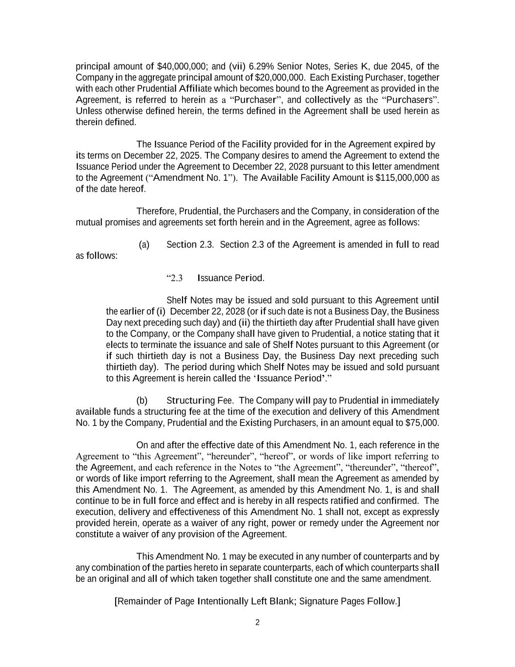 2 principal amount of $40,000,000; and (vii) 6.29% Senior Notes, Series K, due 2045, of the Company in the aggregate principal amount of $20,000,000. Each Existing Purchaser, together with each other Prudential Affiliate which becomes bound to the Agreement as provided in the Agreement, is referred to herein as a “Purchaser”, and collectively as the “Purchasers”. Unless otherwise defined herein, the terms defined in the Agreement shall be used herein as therein defined. The Issuance Period of the Facility provided for in the Agreement expired by its terms on December 22, 2025. The Company desires to amend the Agreement to extend the Issuance Period under the Agreement to December 22, 2028 pursuant to this letter amendment to the Agreement (“Amendment No. 1”). The Available Facility Amount is $115,000,000 as of the date hereof. Therefore, Prudential, the Purchasers and the Company, in consideration of the mutual promises and agreements set forth herein and in the Agreement, agree as follows: (a) Section 2.3. Section 2.3 of the Agreement is amended in full to read as follows: “2.3 Issuance Period. Shelf Notes may be issued and sold pursuant to this Agreement until the earlier of (i) December 22, 2028 (or if such date is not a Business Day, the Business Day next preceding such day) and (ii) the thirtieth day after Prudential shall have given to the Company, or the Company shall have given to Prudential, a notice stating that it elects to terminate the issuance and sale of Shelf Notes pursuant to this Agreement (or if such thirtieth day is not a Business Day, the Business Day next preceding such thirtieth day). The period during which Shelf Notes may be issued and sold pursuant to this Agreement is herein called the ‘Issuance Period’.” (b) Structuring Fee. The Company will pay to Prudential in immediately available funds a structuring fee at the time of the execution and delivery of this Amendment No. 1 by the Company, Prudential and the Existing Purchasers, in an amount equal to $75,000. On and after the effective date of this Amendment No. 1, each reference in the Agreement to “this Agreement”, “hereunder”, “hereof”, or words of like import referring to the Agreement, and each reference in the Notes to “the Agreement”, “thereunder”, “thereof”, or words of like import referring to the Agreement, shall mean the Agreement as amended by this Amendment No. 1. The Agreement, as amended by this Amendment No. 1, is and shall continue to be in full force and effect and is hereby in all respects ratified and confirmed. The execution, delivery and effectiveness of this Amendment No. 1 shall not, except as expressly provided herein, operate as a waiver of any right, power or remedy under the Agreement nor constitute a waiver of any provision of the Agreement. This Amendment No. 1 may be executed in any number of counterparts and by any combination of the parties hereto in separate counterparts, each of which counterparts shall be an original and all of which taken together shall constitute one and the same amendment. [Remainder of Page Intentionally Left Blank; Signature Pages Follow.]