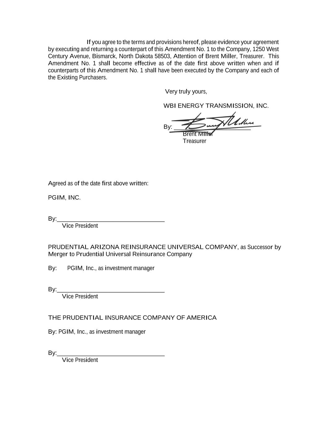 If you agree to the terms and provisions hereof, please evidence your agreement by executing and returning a counterpart of this Amendment No. 1 to the Company, 1250 West Century Avenue, Bismarck, North Dakota 58503, Attention of Brent Miller, Treasurer. This Amendment No. 1 shall become effective as of the date first above written when and if counterparts of this Amendment No. 1 shall have been executed by the Company and each of the Existing Purchasers. Very truly yours, WBI ENERGY TRANSMISSION, INC. By: _________________________ Brent Miller Treasurer Agreed as of the date first above written: PGIM, INC. By:___________________________________ Vice President PRUDENTIAL ARIZONA REINSURANCE UNIVERSAL COMPANY, as Successor by Merger to Prudential Universal Reinsurance Company By: PGIM, Inc., as investment manager By:___________________________________ Vice President THE PRUDENTIAL INSURANCE COMPANY OF AMERICA By: PGIM, Inc., as investment manager By:___________________________________ Vice President