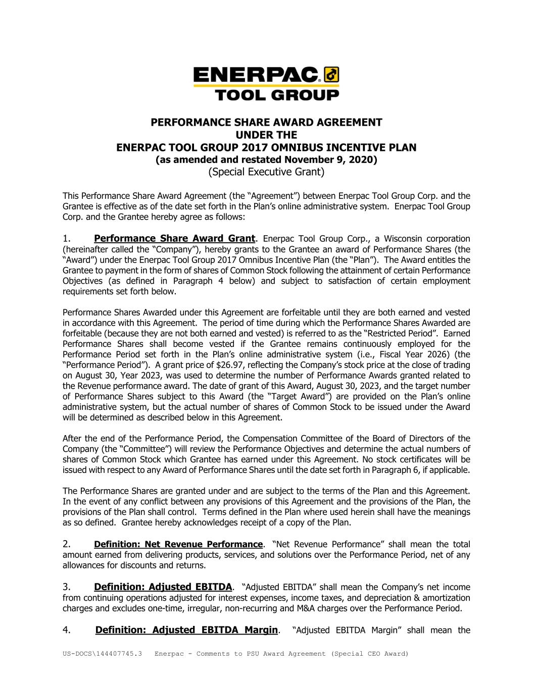 US-DOCS\144407745.3 Enerpac - Comments to PSU Award Agreement (Special CEO Award) PERFORMANCE SHARE AWARD AGREEMENT UNDER THE ENERPAC TOOL GROUP 2017 OMNIBUS INCENTIVE PLAN (as amended and restated November 9, 2020) (Special Executive Grant) This Performance Share Award Agreement (the “Agreement”) between Enerpac Tool Group Corp. and the Grantee is effective as of the date set forth in the Plan’s online administrative system. Enerpac Tool Group Corp. and the Grantee hereby agree as follows: 1. Performance Share Award Grant. Enerpac Tool Group Corp., a Wisconsin corporation (hereinafter called the “Company”), hereby grants to the Grantee an award of Performance Shares (the “Award”) under the Enerpac Tool Group 2017 Omnibus Incentive Plan (the “Plan”). The Award entitles the Grantee to payment in the form of shares of Common Stock following the attainment of certain Performance Objectives (as defined in Paragraph 4 below) and subject to satisfaction of certain employment requirements set forth below. Performance Shares Awarded under this Agreement are forfeitable until they are both earned and vested in accordance with this Agreement. The period of time during which the Performance Shares Awarded are forfeitable (because they are not both earned and vested) is referred to as the “Restricted Period”. Earned Performance Shares shall become vested if the Grantee remains continuously employed for the Performance Period set forth in the Plan’s online administrative system (i.e., Fiscal Year 2026) (the “Performance Period”). A grant price of $26.97, reflecting the Company’s stock price at the close of trading on August 30, Year 2023, was used to determine the number of Performance Awards granted related to the Revenue performance award. The date of grant of this Award, August 30, 2023, and the target number of Performance Shares subject to this Award (the “Target Award”) are provided on the Plan’s online administrative system, but the actual number of shares of Common Stock to be issued under the Award will be determined as described below in this Agreement. After the end of the Performance Period, the Compensation Committee of the Board of Directors of the Company (the “Committee”) will review the Performance Objectives and determine the actual numbers of shares of Common Stock which Grantee has earned under this Agreement. No stock certificates will be issued with respect to any Award of Performance Shares until the date set forth in Paragraph 6, if applicable. The Performance Shares are granted under and are subject to the terms of the Plan and this Agreement. In the event of any conflict between any provisions of this Agreement and the provisions of the Plan, the provisions of the Plan shall control. Terms defined in the Plan where used herein shall have the meanings as so defined. Grantee hereby acknowledges receipt of a copy of the Plan. 2. Definition: Net Revenue Performance. “Net Revenue Performance” shall mean the total amount earned from delivering products, services, and solutions over the Performance Period, net of any allowances for discounts and returns. 3. Definition: Adjusted EBITDA. “Adjusted EBITDA” shall mean the Company’s net income from continuing operations adjusted for interest expenses, income taxes, and depreciation & amortization charges and excludes one-time, irregular, non-recurring and M&A charges over the Performance Period. 4. Definition: Adjusted EBITDA Margin. “Adjusted EBITDA Margin” shall mean the