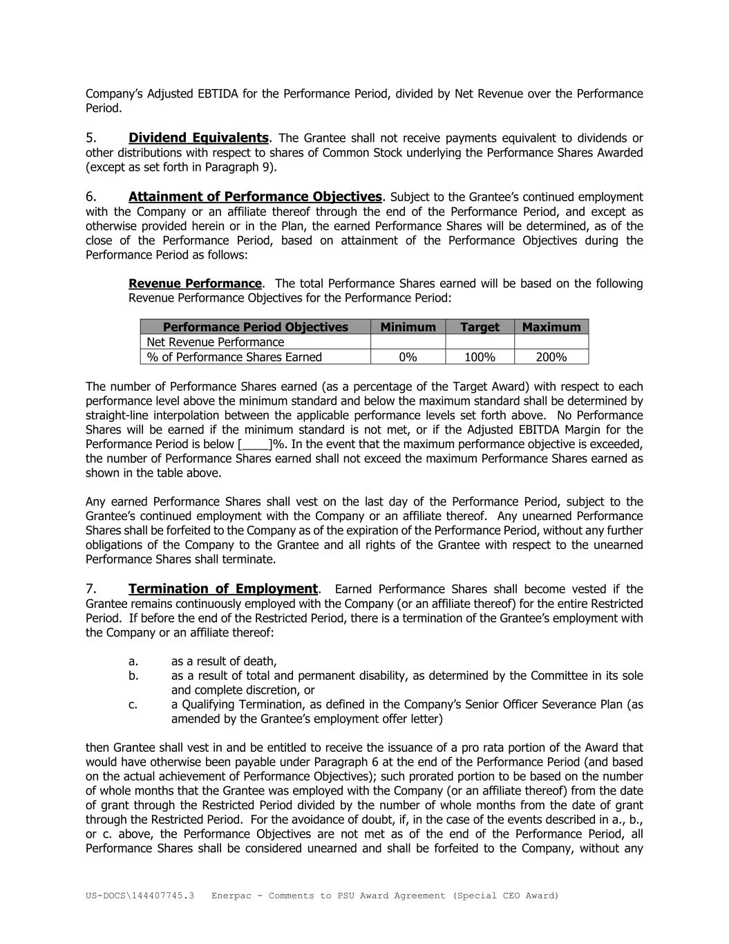 US-DOCS\144407745.3 Enerpac - Comments to PSU Award Agreement (Special CEO Award) Company’s Adjusted EBTIDA for the Performance Period, divided by Net Revenue over the Performance Period. 5. Dividend Equivalents. The Grantee shall not receive payments equivalent to dividends or other distributions with respect to shares of Common Stock underlying the Performance Shares Awarded (except as set forth in Paragraph 9). 6. Attainment of Performance Objectives. Subject to the Grantee’s continued employment with the Company or an affiliate thereof through the end of the Performance Period, and except as otherwise provided herein or in the Plan, the earned Performance Shares will be determined, as of the close of the Performance Period, based on attainment of the Performance Objectives during the Performance Period as follows: Revenue Performance. The total Performance Shares earned will be based on the following Revenue Performance Objectives for the Performance Period: Performance Period Objectives Minimum Target Maximum Net Revenue Performance % of Performance Shares Earned 0% 100% 200% The number of Performance Shares earned (as a percentage of the Target Award) with respect to each performance level above the minimum standard and below the maximum standard shall be determined by straight-line interpolation between the applicable performance levels set forth above. No Performance Shares will be earned if the minimum standard is not met, or if the Adjusted EBITDA Margin for the Performance Period is below [____]%. In the event that the maximum performance objective is exceeded, the number of Performance Shares earned shall not exceed the maximum Performance Shares earned as shown in the table above. Any earned Performance Shares shall vest on the last day of the Performance Period, subject to the Grantee’s continued employment with the Company or an affiliate thereof. Any unearned Performance Shares shall be forfeited to the Company as of the expiration of the Performance Period, without any further obligations of the Company to the Grantee and all rights of the Grantee with respect to the unearned Performance Shares shall terminate. 7. Termination of Employment. Earned Performance Shares shall become vested if the Grantee remains continuously employed with the Company (or an affiliate thereof) for the entire Restricted Period. If before the end of the Restricted Period, there is a termination of the Grantee’s employment with the Company or an affiliate thereof: a. as a result of death, b. as a result of total and permanent disability, as determined by the Committee in its sole and complete discretion, or c. a Qualifying Termination, as defined in the Company’s Senior Officer Severance Plan (as amended by the Grantee’s employment offer letter) then Grantee shall vest in and be entitled to receive the issuance of a pro rata portion of the Award that would have otherwise been payable under Paragraph 6 at the end of the Performance Period (and based on the actual achievement of Performance Objectives); such prorated portion to be based on the number of whole months that the Grantee was employed with the Company (or an affiliate thereof) from the date of grant through the Restricted Period divided by the number of whole months from the date of grant through the Restricted Period. For the avoidance of doubt, if, in the case of the events described in a., b., or c. above, the Performance Objectives are not met as of the end of the Performance Period, all Performance Shares shall be considered unearned and shall be forfeited to the Company, without any